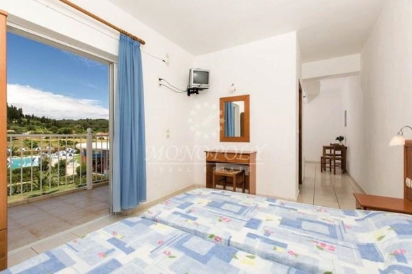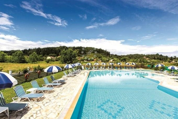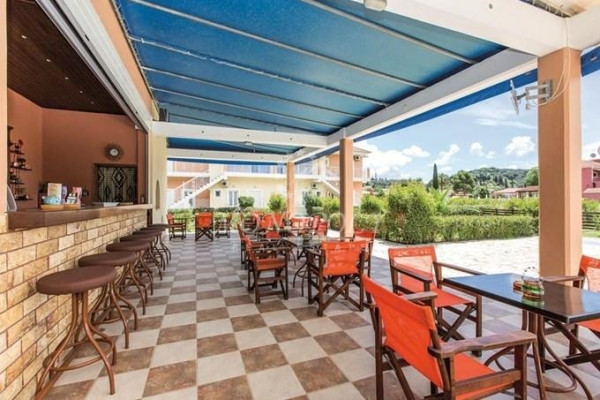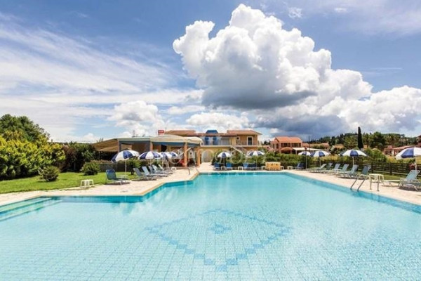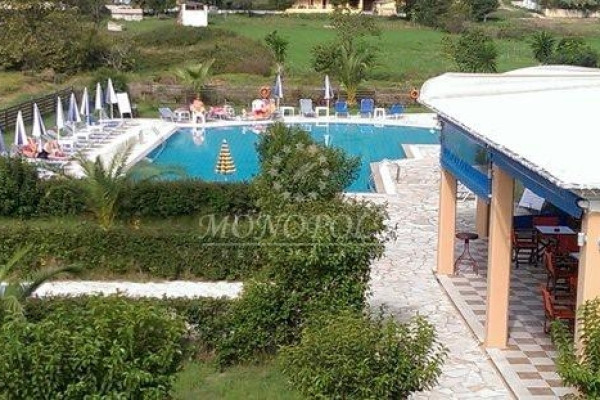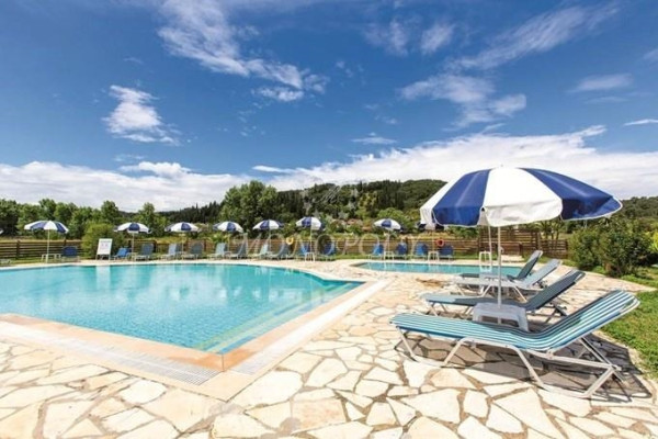 North Corfu, Sidari village, Modern studios & apartments of 600 sq.m., completed in 2006, on ground and 1st floor, with 18 modern studios that can sleep up to 5 people each. On a plot of 8 acres, with a large garden with trees, it has 2 boreholes and underground water tanks, 2 swimming pools, one 220 sq.m. and a second smaller one for children, a 200 m2 restaurant, bar, pool bar, and auxiliary areas for dressing. The rooms have a balcony, air conditioning, kitchenette, refrigerator and cooking utensils. It has a large space for parking. It is situated in a quiet location on the outskirts of Sidari surrounded by well-kept gardens, trees and hills. Provides comfortable accommodation and a homely, welcome atmosphere. An ideal choice for families and couples who want a relaxing and peaceful holidays not far from the beach and all the resort amenities. Located in a distance of 800 meters from Sidari sandy beach, and 1,2 km from wonderful (canal d`amour) beach. 300 meters away from the resort center, super markets, bars, restaurants and the main nightlife are 900 meters away.