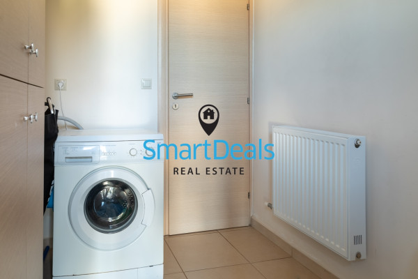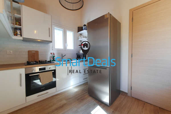 Die Wohnung im Erdgeschoss besteht aus einer geräumigen offenen Küche, die zum Wohnzimmer offen ist und in einem kleinen geschützten grünen Innenhof sieht. Auf der gleichen Ebene gibt es 2 Schlafzimmer und ein Badezimmer.