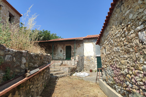 In Platanos green village, a transitional 70sqm single house on a 252sqm flat plot. Two bedrooms, one external bathroom, separate kitchen area, 30sqm storage, open parking, nice hill-view terraces. Access via asphalt street, 1,5klm to the main road, 8klm to Romanos beach.