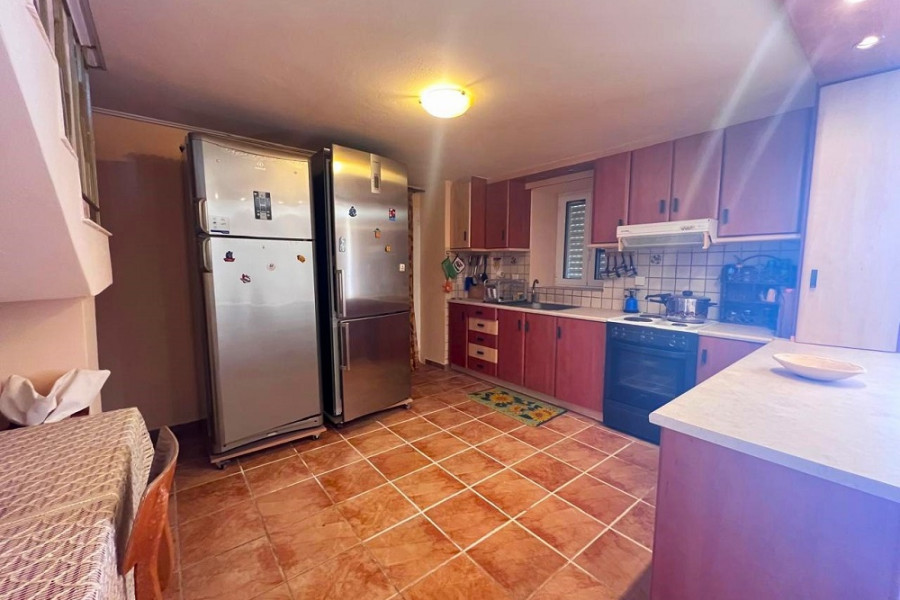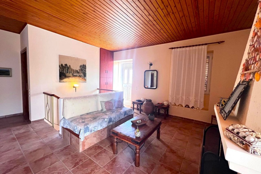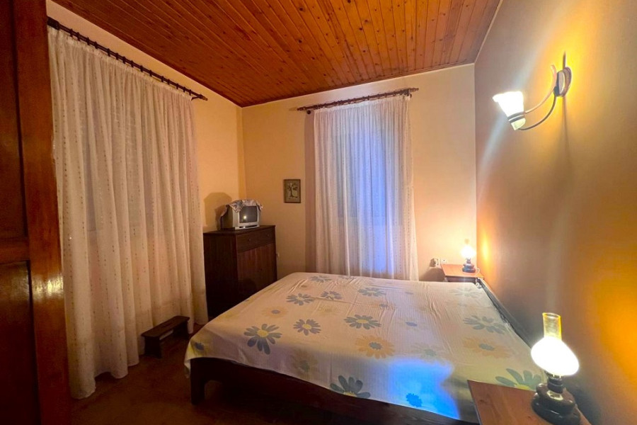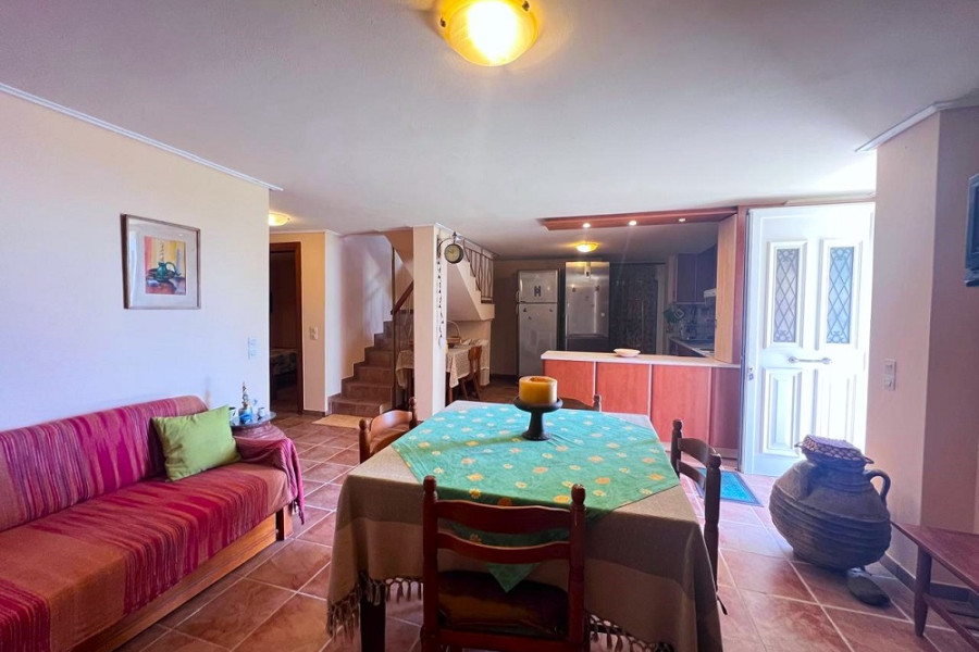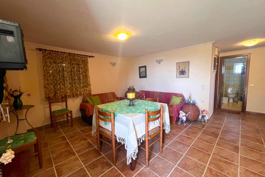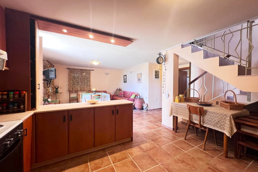 The ground floor offers the joined area where the kitchen lies, two bedrooms and one bathroom, a tiled staircase leads upstairs where you can find the sitting area with fireplace, three more bedrooms and one bathroom.