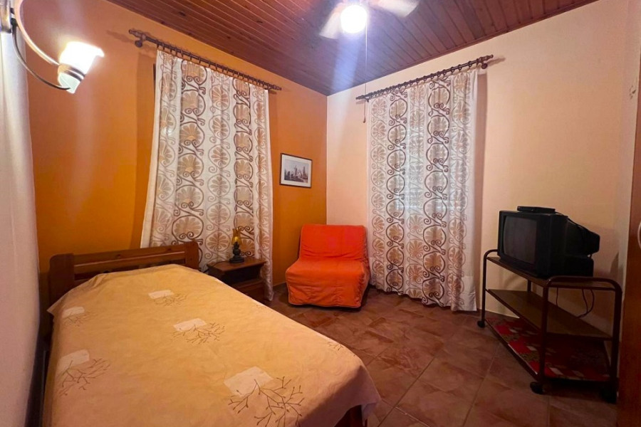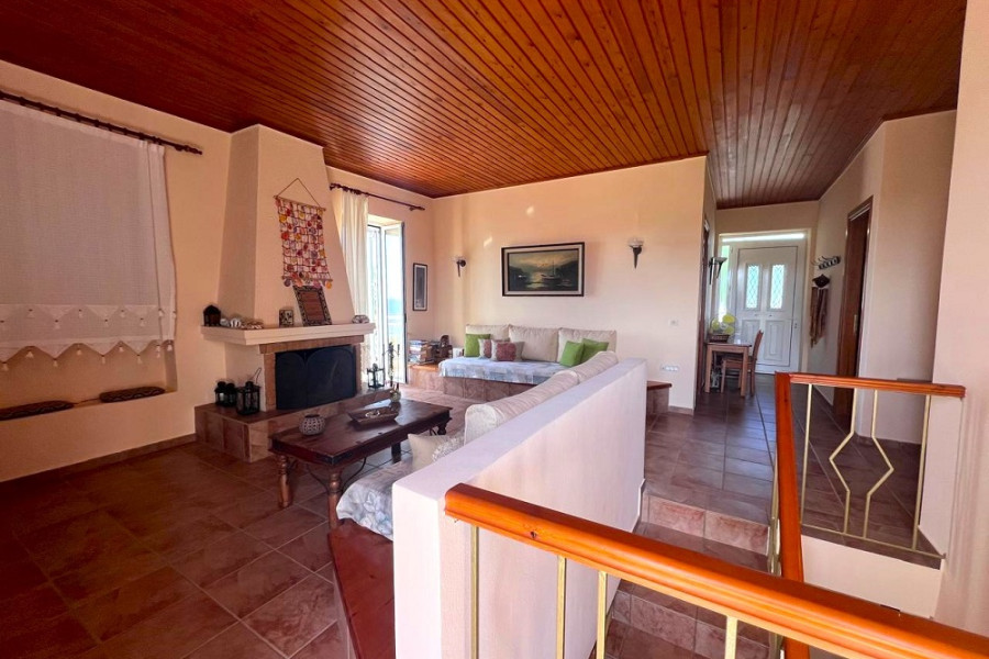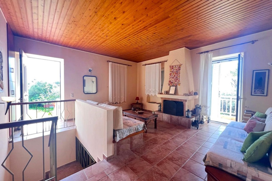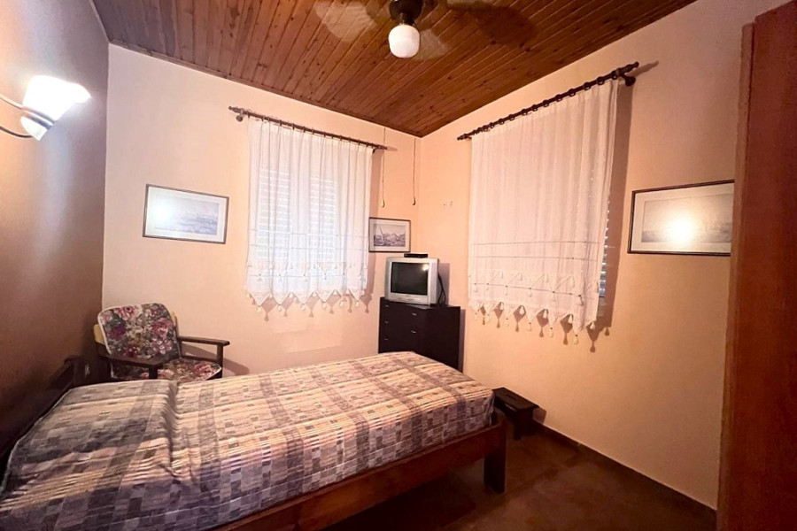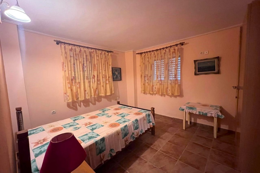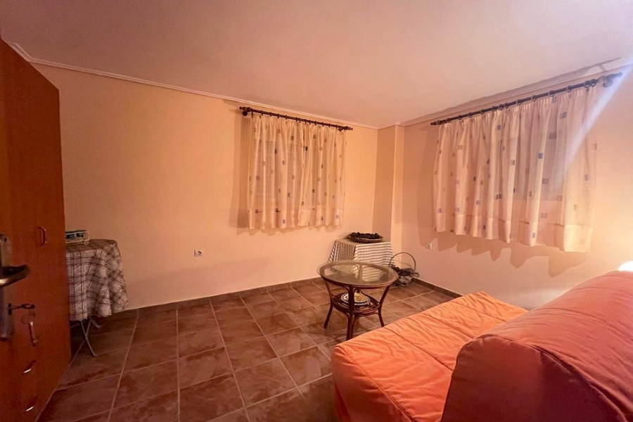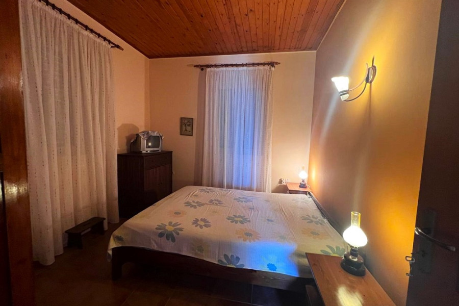 The ground floor offers the joined area where the kitchen lies, two bedrooms and one bathroom, a tiled staircase leads upstairs where you can find the sitting area with fireplace, three more bedrooms and one bathroom.