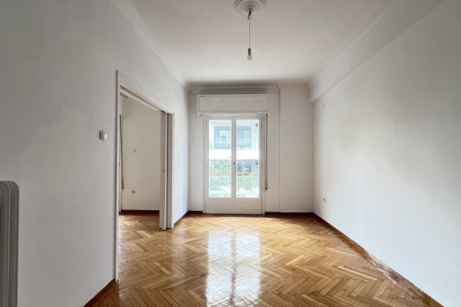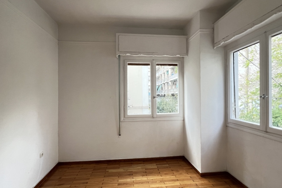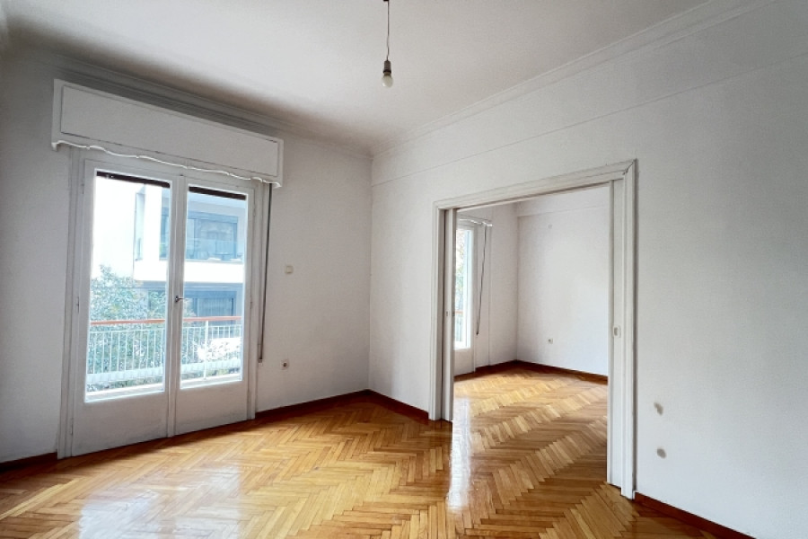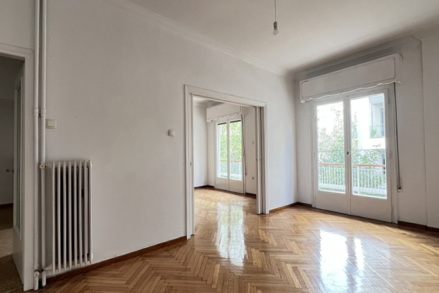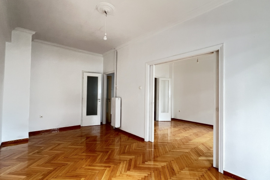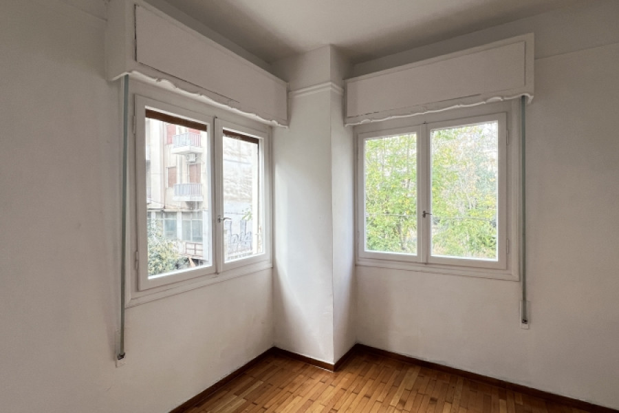 This magnificent first-floor corner apartment perfectly combines functionality and aesthetics. One side boasts a view of a tree-lined pedestrian walkway and an elegant neoclassical building, creating an atmosphere of tranquillity and beauty. The apartment is bright and spacious with two bedrooms and two reception areas. One of the reception areas could be converted into a third bedroom or a home office for those who work from home. In addition, there is a separate room that can be used as a storage room or pantry, which is accessible from the kitchen. The kitchen is spacious with an elevated storage space and its own balcony in the uncovered area. The large bathroom has space for a washer-dryer, and there is also a guest WC with an additional storage space. The recently maintained wooden floors with an impressive herringbone pattern add a sense of elegance to the space. The property is in a strategic location, close to public transport, Fokionos Negri Street and Agios Georgios Square. It is an excellent proposition at a very good price, with potential for development according to the needs and aesthetic preferences of its new owners.
