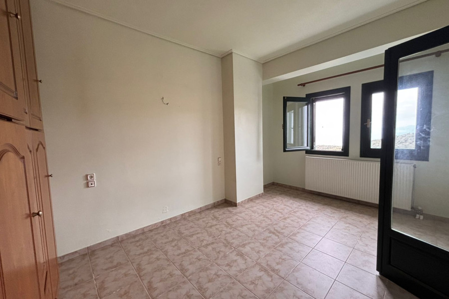 A 206 sqm maisonette is for sale in Afetes, Pelion, offering stunning views. It consists of three levels. The main entrance to the maisonette is on the third level, which includes a kitchen, a spacious living room with a fireplace, and a bathroom. An internal staircase leads to the second level, where there are three bedrooms and a bathroom.