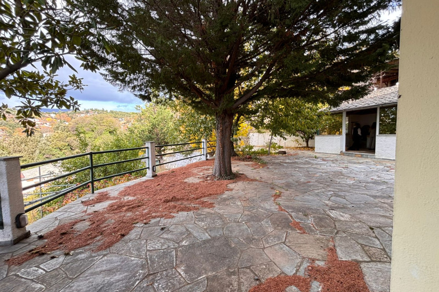 The house boasts breathtaking views and shares a wall with another maisonette. It comes with its own 1078 sqm plot of land. The courtyard is paved with Pelion stone and features a BBQ area.