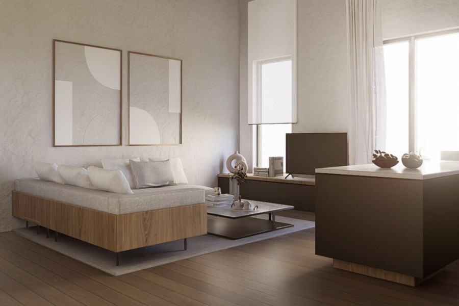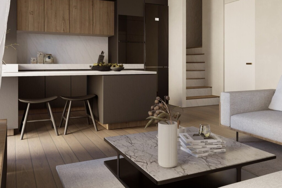 This stylish 52 sqm apartment occupies a ground-floor mezzanine, offering a smart and flexible layout ideal for contemporary city life. Upon entering, you are welcomed into an open-plan living and kitchen area with WC, designed to maximize comfort and functionality. High ceilings and large windows enhance the sense of space, creating a bright, airy, and inviting atmosphere.