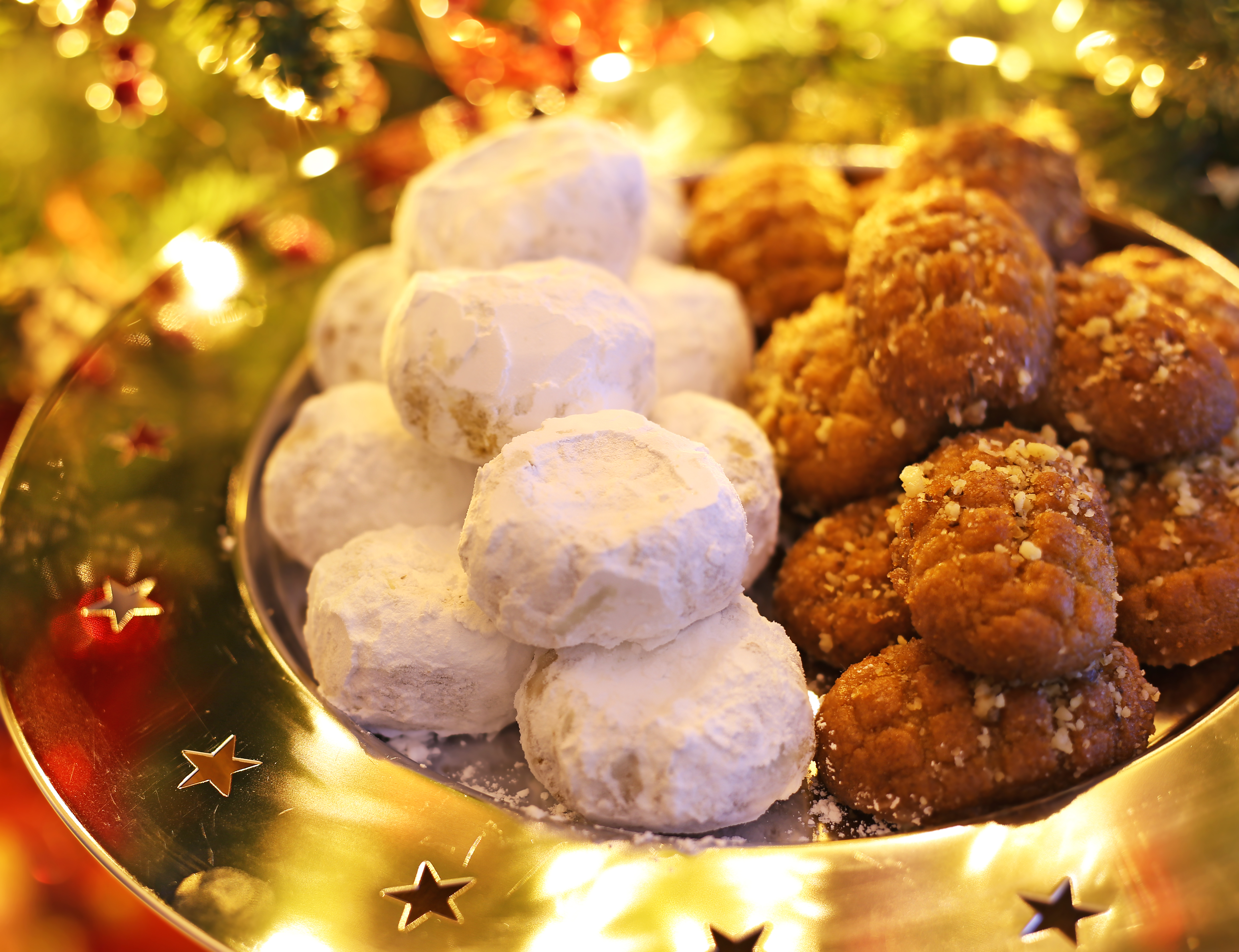 Κουραμπιέδες: Ντελικάτα μπισκότα βουτύρου με αμύγδαλο και άχνη ζάχαρη.