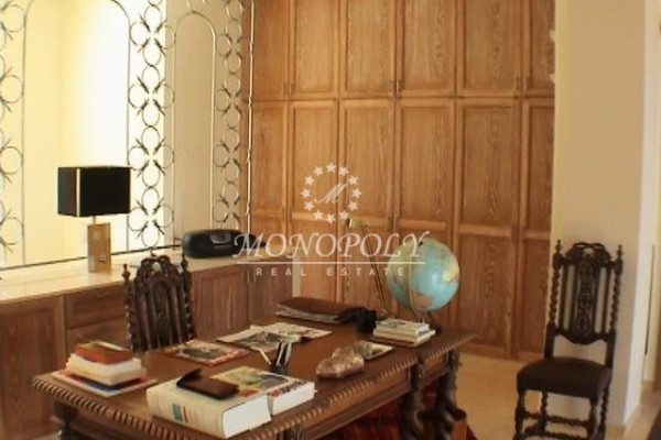 There is a living room marble fireplace and floors, a dining area, an office and many large windows around offering plenty of light and seamless panoramic views of the garden, the sea and the mountain. There is 1 WC, a laundry room and the fully equipped main kitchen with a counter of solid beech.