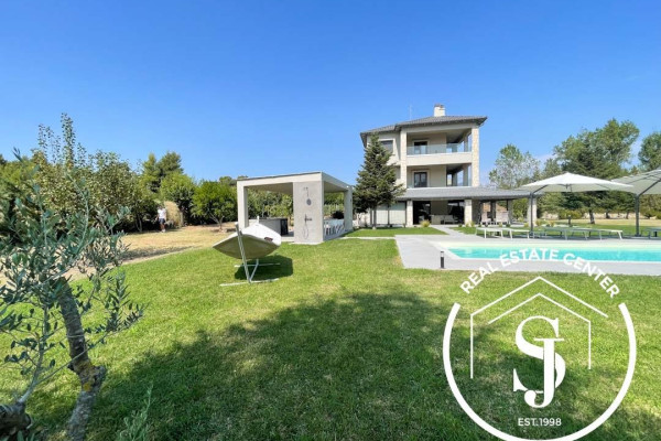 Custom-built country living villa, in flawless condition, with plenty of privacy. Only 245 meters and a 3 minute walk to the stunning sandy beach near Glarokavos. Distance to Thessaloniki airport: 95km The villa, built in 2002 & repainted in 2021, is located on the first peninsula of Chalkidiki near the village of Paliouri (Glarokavos location). It is built on a plot of 1,200 sq.m. and has a surface of 260 sq.m. It comes with all standard furniture, and all electrical appliances (fully equipped). The villa boasts an independent BBQ with a pergola and sitting/dining area, whereas its gated green garden of 1,100 sq. m. offers plenty of tall mature trees, bushes and plants for shade and outdoor entertaining and activities. The villa expands on levels and its main structure encompasses a basement, a ground floor and an upper level. Main indoor spaces: 2 living rooms 1 open plan, extensive gourmet chef kitchen with a long dining table. 5 bedrooms (1 with en suite bathroom, 2 boasting attics) 3 bathrooms Inside and outside spaces have beige natural stone flooring (tufa), whereas bedrooms have terracotta floor finishings. The villa also comes with a security door with extra secure locks, a fireplace, aluminum window fittings, numerous skylights, spacious storage and laundry rooms, automatic watering system for the garden, automatic lighting system in all outside areas, water reserve to cover the needs of the estate all day long, and 2 parking spaces. There are also pre-installations for alarm and heating systems.