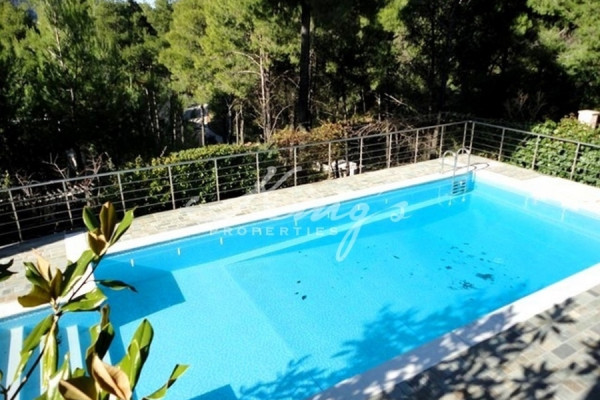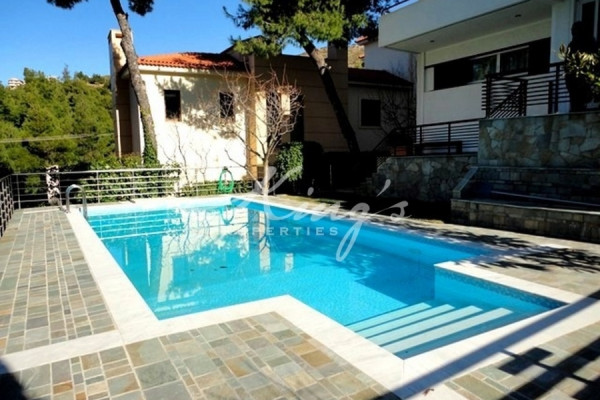 DIONISOS, in lush green environment, for sale, excellent detached house 390sqm, with swimming pool and beautiful landscaped garden, in a plot of 518sqm, renovated, in excellent condition, on the ground floor large living room, seating area with fireplace, dining room at a level, wc, separate large kitchen with electrical appliances, on the 1st floor 3 large bedrooms (one with fireplace, suitable for office ), large balconies, 1 large bathroom. Playroom on the ground floor opens onto the garden and pool, is completely independent, with kitchen, living room with fireplace, 1 large bedroom, bathroom with shower, storage, laundry. Autonomous heating per level, pre-installation for alarm system, boiler, closed parking, KING`S PROPERTIES - www.kingsproperties.gr - tel: +30210 8014300
