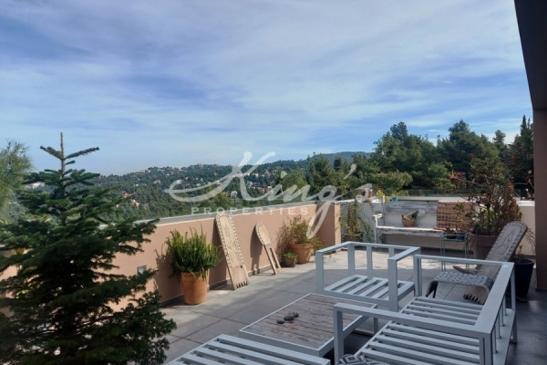 DROSIA- REA, for sale, newly excellent minimal penthouse apartment 250sqm, with private pool in a specially landscaped level, by famous architect, huge living room with fireplace in modern style, dining area, very bright separate kitchen, large wc, 3 bedrooms with balcony (one large master bedroom with spacious bathroom with double shower), bathroom with bathtub. Large comfortable wooden staircase leads to a spacious loft area, bright, with spectacular view, ideal for office or 4th bedroom, bathroom with shower. Maid`s room with bathroom with shower in its own separate space, laundry room. Independent underfloor heating, solar water heater, boiler, satellite dish, electric shutters, alarm system, very good insulation, basement parking for 2 cars, 2 storage spaces, KING`S PROPERTIES - www.kingsproperties.gr - tel: +30210 8014300