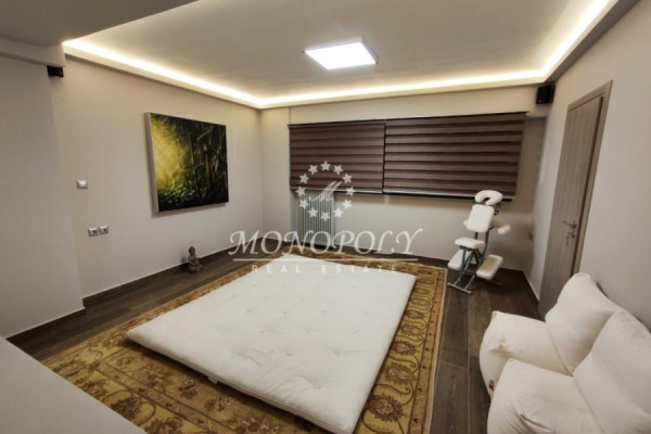 The ground floor is 240 sq.m, is bright from the front to the back, and airy. It consists of an open single room, a kitchenette, 2 WC`s, and parking space. It has tiled floor, false ceilings and central air conditioning installation. There is a possibility to use for sanitary purposes. It is ideal for a gym, tutoring center, schools, company offices, doctor`s office, room for various uses and events.