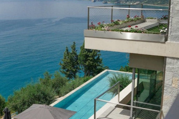 The outdoor spaces have been carefully crafted for comfort and style, featuring a private swimming pool, Jacuzzi, and shaded outdoor living and dining areas under wooden pergolas. Expansive, stone-paved terraces made with natural materials frame panoramic views of the Ionian Sea, creating the perfect setting for relaxation and hospitality.