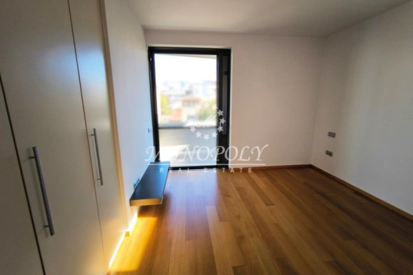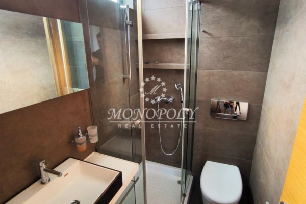 The top floor consists of a large reception area, a lounge and dining area with a double-sided fireplace, a large southwest oriented veranda, 1 WC, a large separated kitchen with balcony, fully equipped with Gaggenau electrical appliances, and a master bedroom with a bath and a balcony. The whole floor has many windows that make it very bright and all the floors are wooden.