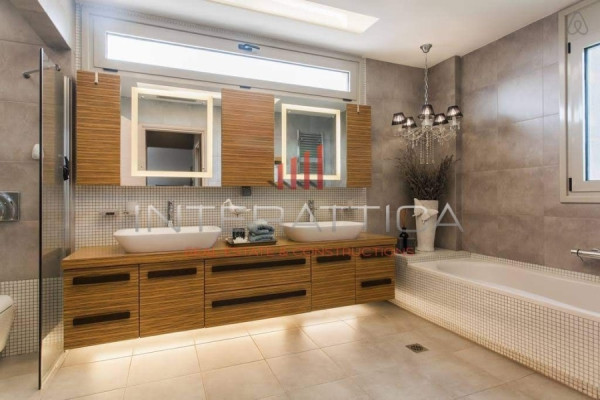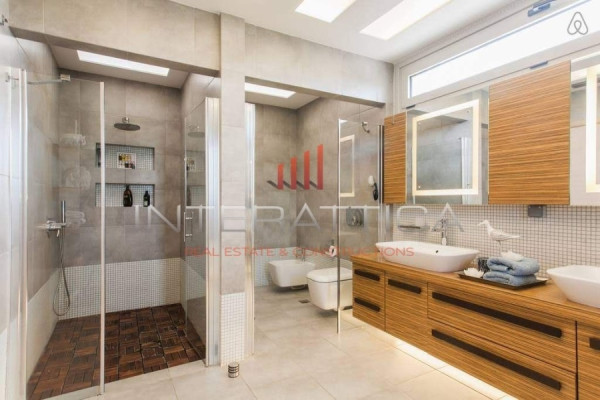 Finally, the villa has a beautifully landscaped area with lawns, olive trees and automatic watering, unlimited space for parties and receptions, a 20m swimming pool with 2 jacuzzis, an outdoor shower, a guest WC, a caretaker's house next to the entrance with a kitchenette, bedroom and bathroom.