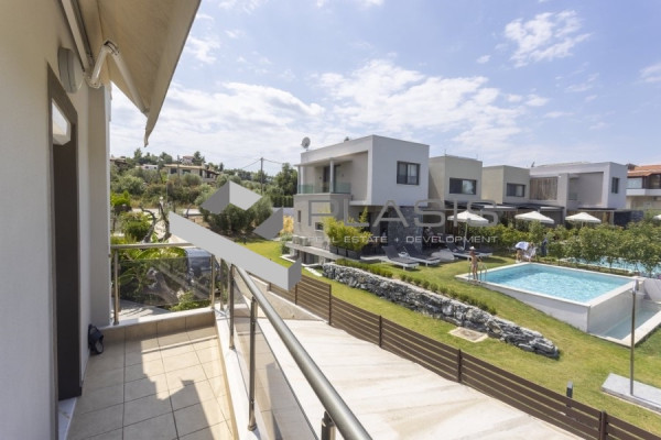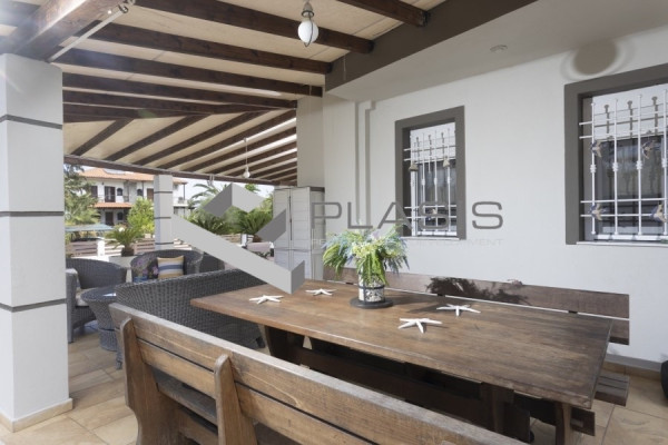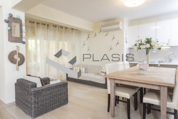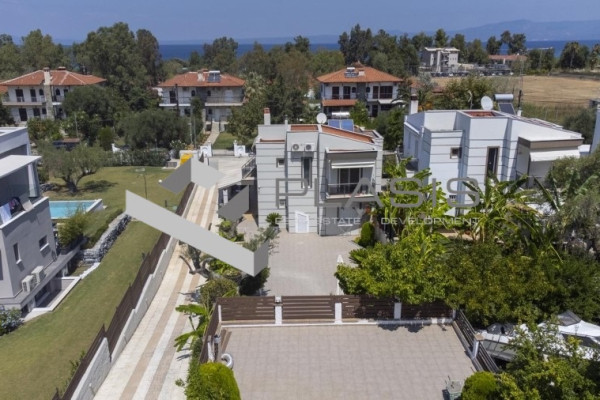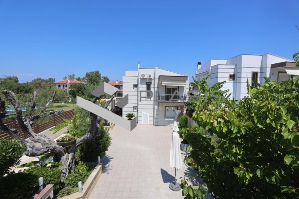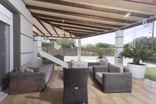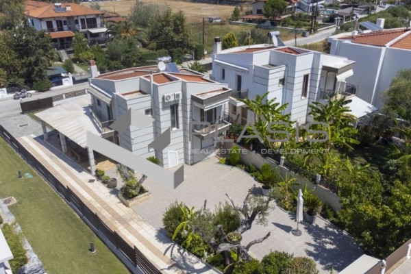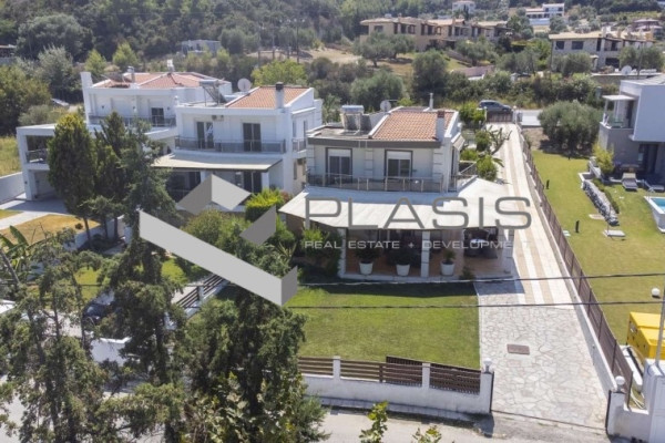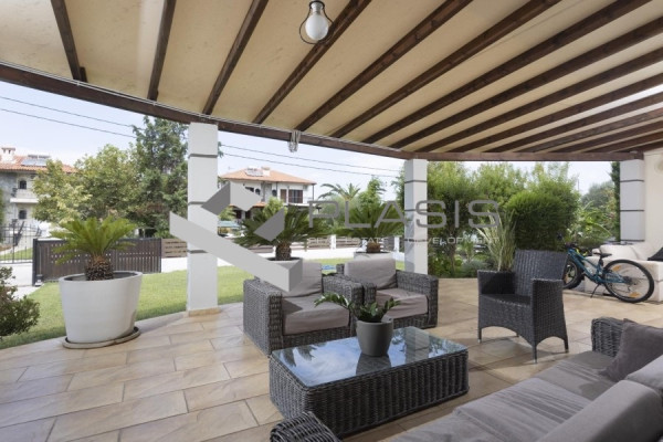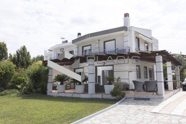 Pallini, Pefkohori, Detached House For Sale, 150 sq.m., On a plot of 750 sq.m., Condition: Amazing, Floor: Ground Floor, 2 Level(s), 4 Bedrooms 1 Kitchen(s), 2 Bathroom(s), Heating: Autonomous - Oil, View: Good, Year of Construction: 2012, Energy Certificate: A, 6 parking space(s), Floors: oak, Security Door, Storage, Fireplace, Electrical Appliances, Internal Staircase, Awnings, Verandas, BBQ, Furnished, Airy, Bright, Air Conditioning, Solar, Lawn, Automatic Watering, Trees, 2-level detached house for sale, total area 150sqm, on a total area of 750sqm, within a plot of land with the right of exclusive use, It consists of 4 large bedrooms, 1 single living room kitchen and 2 bathrooms. It has a separate warehouse, kitchen and outdoor barbecue area and 5 to 6 parking spaces. It has easy access to the sea. It is also habitable in winter, The entrance to the plot with the independent maisonettes is from 2 entrances: from the rural and the main road, Price: €760,000. Plasis Glyfada, Tel. Contact: +30 2109601909 +30 2109601609, email: