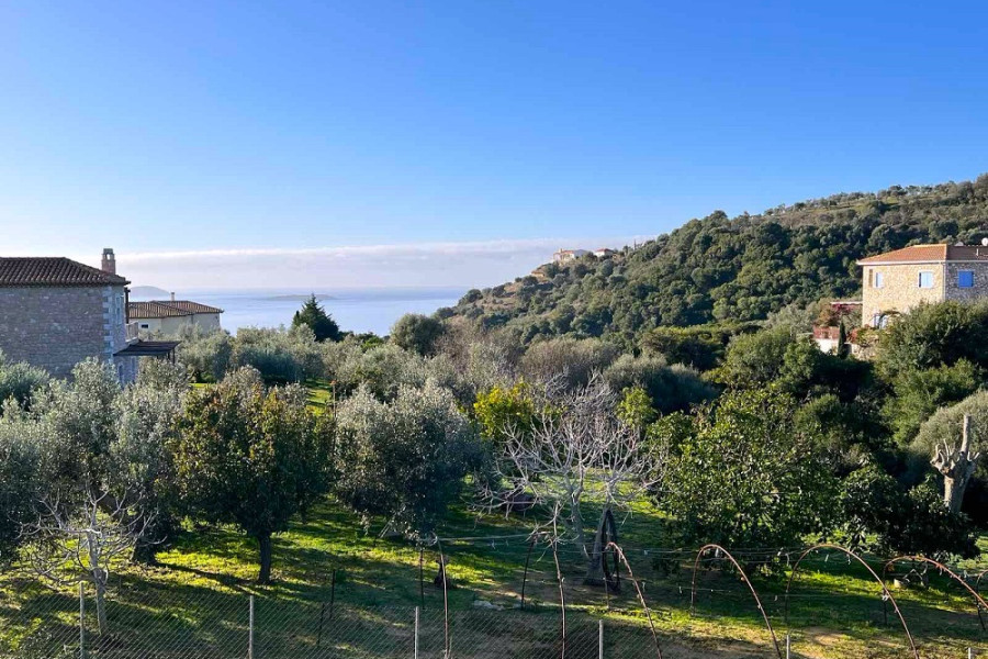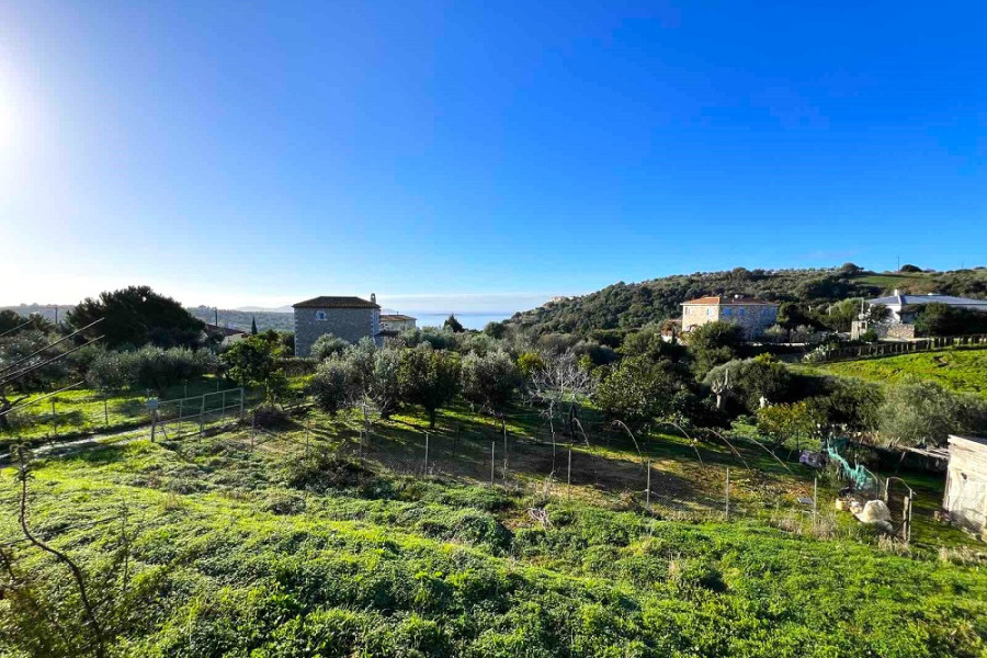 Enjoyable views over the neighboring houses to the hills and the sea, by the asphalt street.