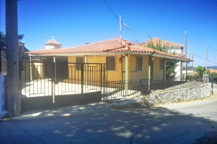 In Platanos green village, a transitional 70sqm single house on a 252sqm flat plot. Two bedrooms, one external bathroom, separate kitchen area, 30sqm storage, open parking, nice hill-view terraces. Access via asphalt street, 1,5klm to the main road, 8klm to Romanos beach.