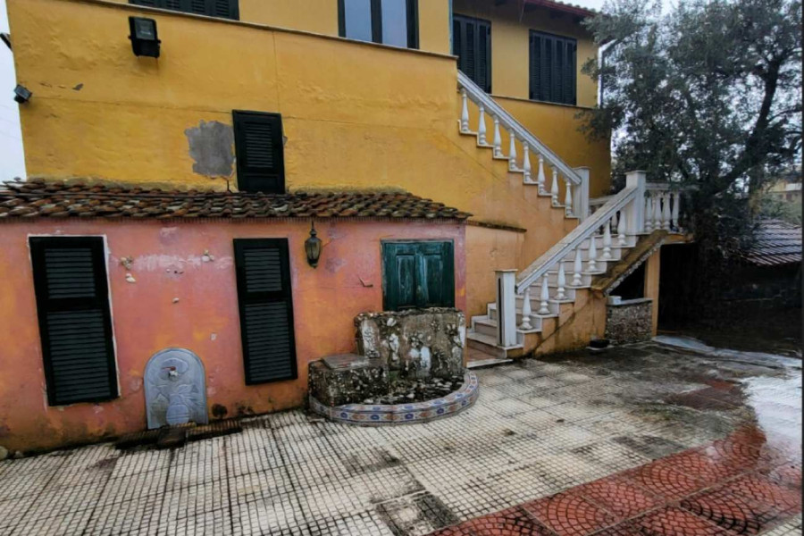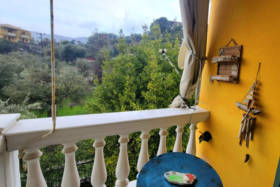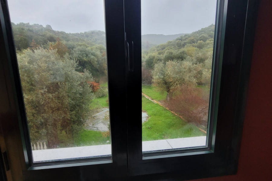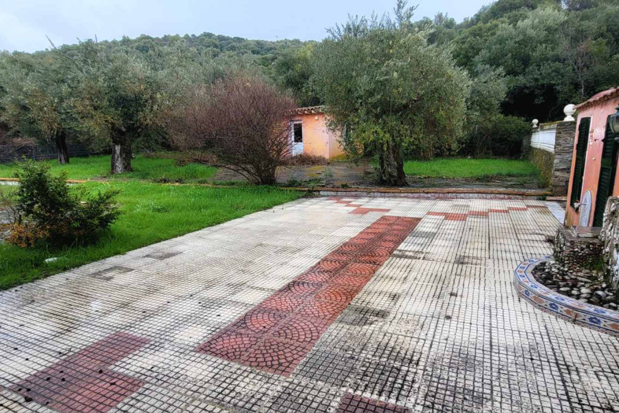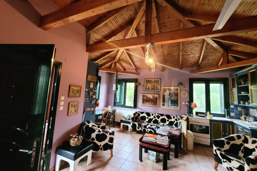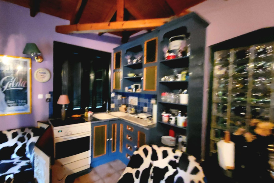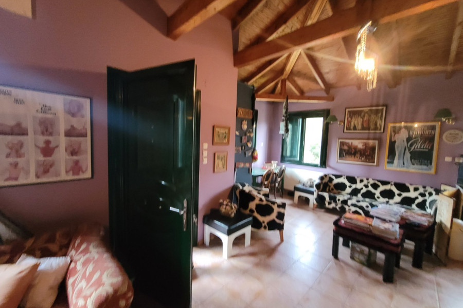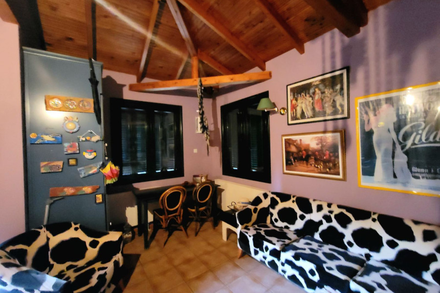 This is a 2-level detached house, within a privately owned plot of 1700 sq m. The main house is located on the upper level and consists of a single space where the living room with the large fireplace of the house and the kitchen are located, 3 comfortable bedrooms, 2 fully equipped bathrooms and an additional, smaller auxiliary kitchen.