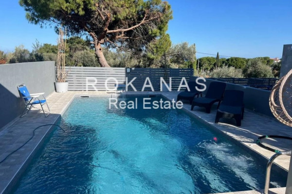 For Sale Detached house, Nea Makri, Zouberi-Florida, 155 sq.m., In plot 400 sq.m., 3 Levels, Ground floor Floor, 5 Bedrooms, 3 Bathrooms, 2 Κitchen/s, 1 Fireplace, Floors: Tiles, Frames: Aluminum, 1 parking, Certificate Energy: A, Feautures: Elevator, Security door, Security alarm, CCTV, Storage room, Fireplace, Electric Appliances, Double Glazed Windows, Window Screens, Balconies, BBQ, Luxury, Airy, Roadside, Bright, AirConditioning, Solar water system, Swimming pool, Back yard (Garden), Renovated, Holiday Home, View: Sea view, Price: 500.000€