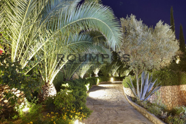 The surrounding area is a real gem: a rich, well-kept garden with lawns, olive trees, palms, cypresses and over 3,000 roots with aromatic and ornamental plants such as lavender, rosemary, oregano and thyme. The automatic underground and above-ground watering system ensures an excellent view of the garden all year round.