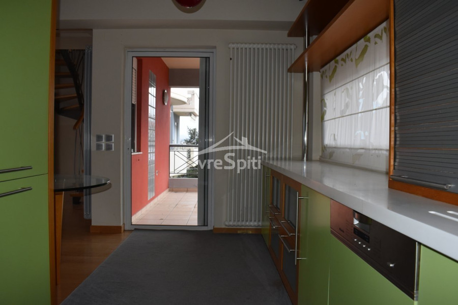 Communication is via the internal comfortable wooden staircase, but also via the elevator since the maisonette has 2 entrances (on 2 levels, that is)