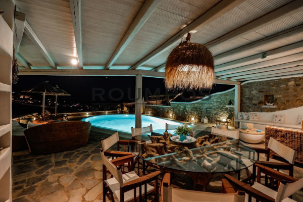 As you enter the property, you're welcomed by a well-designed outdoor area featuring a private pool, comfortable sun loungers, and inviting shaded lounge spots under pergolas. The stone wall, natural materials, and unobstructed views of the Aegean Sea create an atmosphere of serenity and elegance. The exterior space also includes a sitting area, dining space, and a BBQ zone – perfect for enjoying summer moments with friends and family.