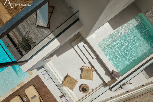 Ground Floor: Spacious living room with an open kitchen and access to the main pool, two master bedrooms with private bathrooms.