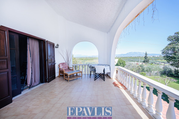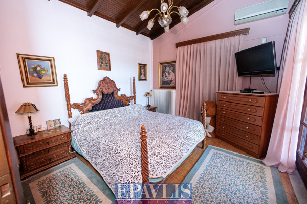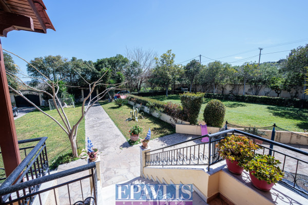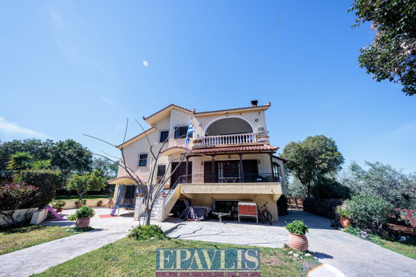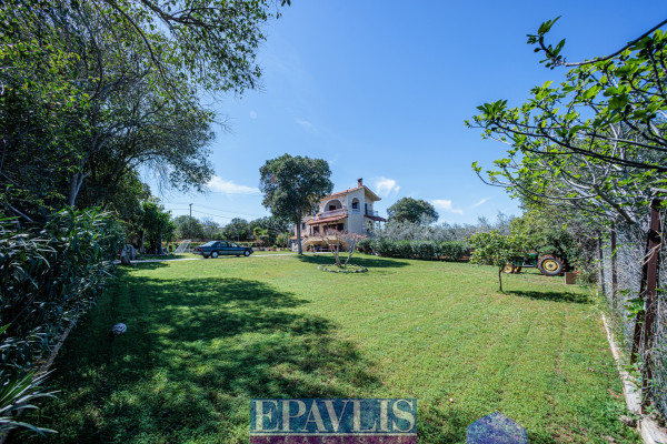 The property is bright, airy, open on all sides, suitable for a holiday home, permanent residence, or investment. Additional features include a large landscaped garden with trees, lawn, plants, a well, automatic irrigation, electrical appliances, storage, attic, alarm system, BBQ, wood-fired oven, and it allows pets. Price: €350,000. EPAVLIS REALTORS, Tel: 2109945719, email: