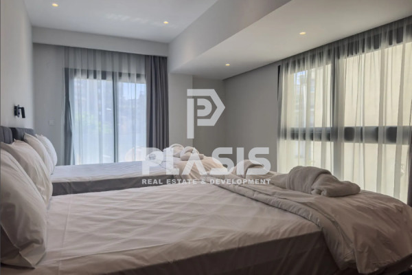 It consists of three bedrooms, a single living room and two bathrooms. It has underfloor heating with a heat pump, offering high energy efficiency and comfort. The frames are synthetic with double energy glazing and screens, while the floors are covered with modern tiles. The apartment also has air conditioning (A/C), armored security door, elevator and storage room.
