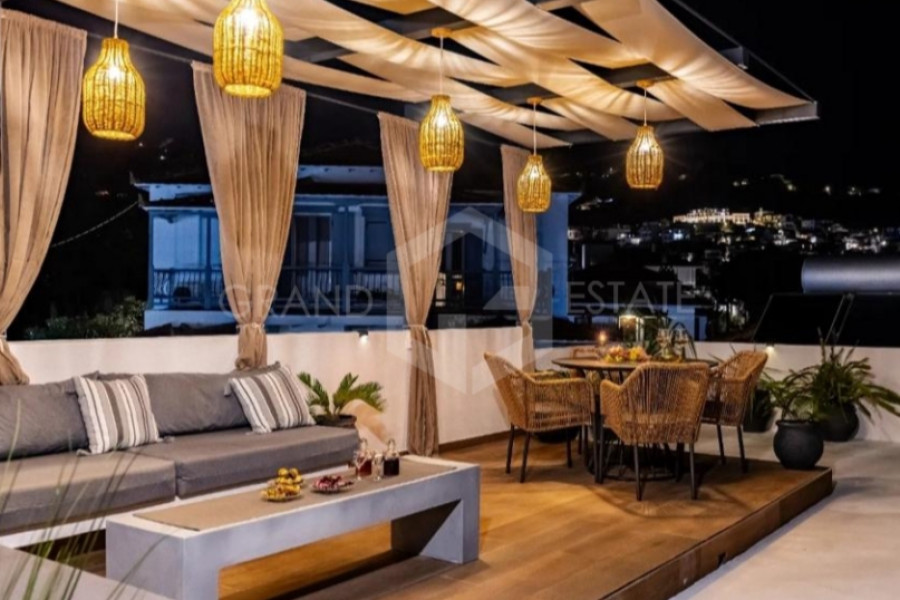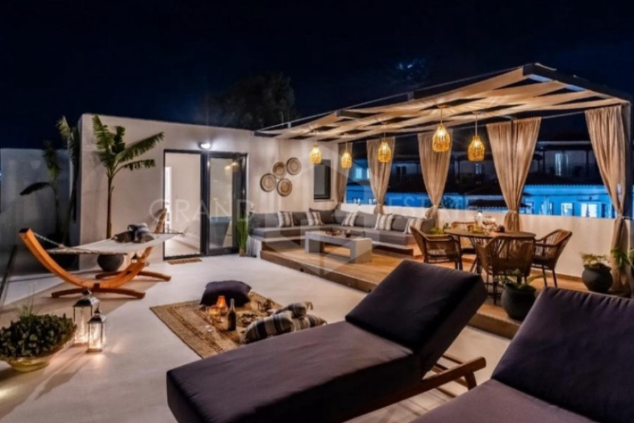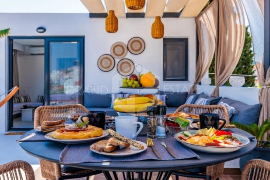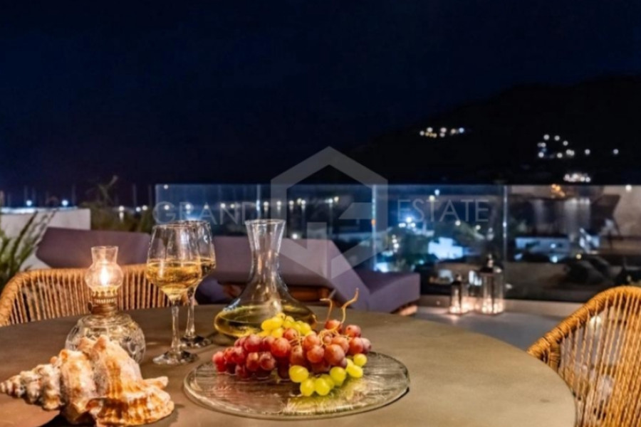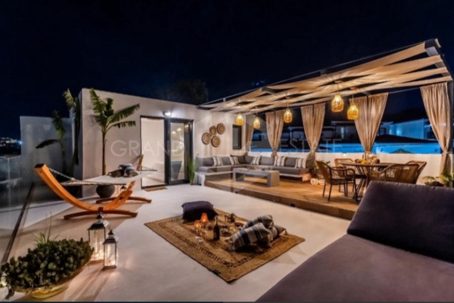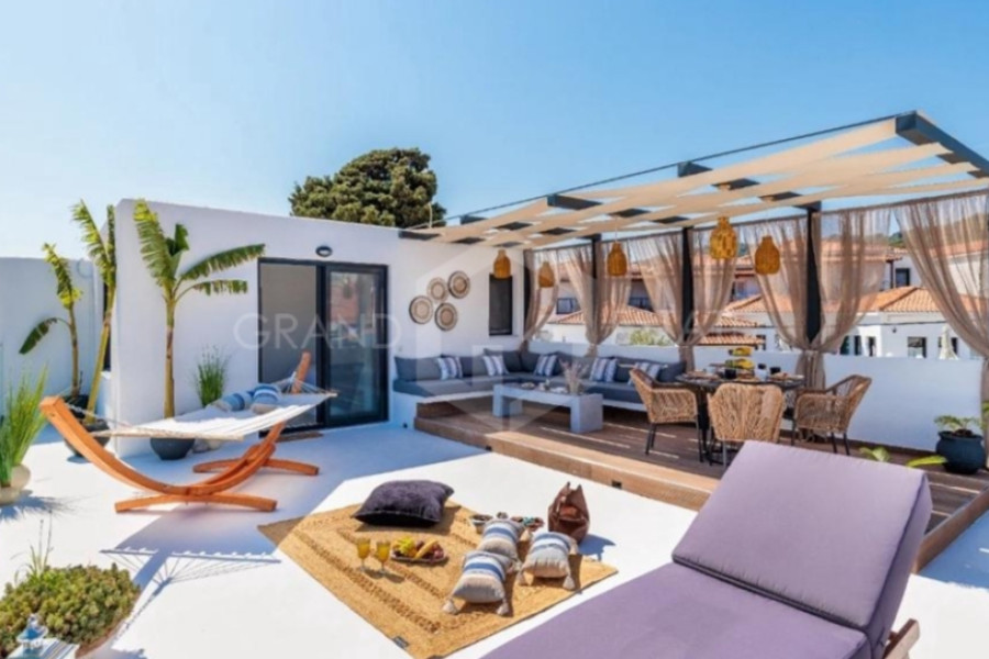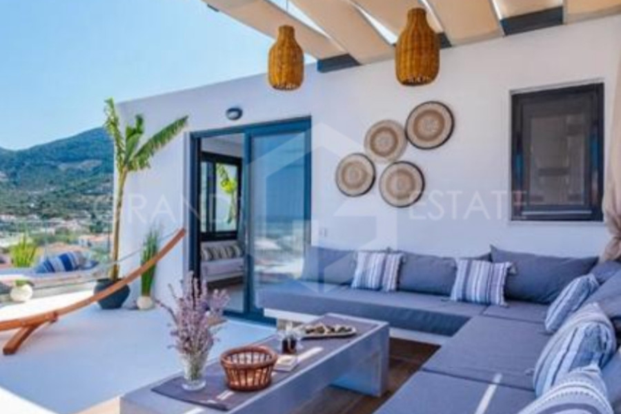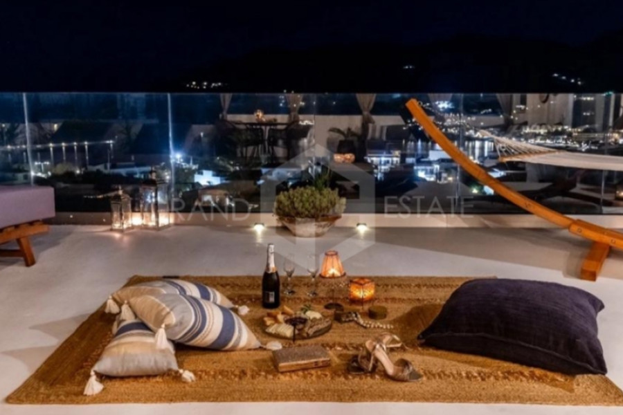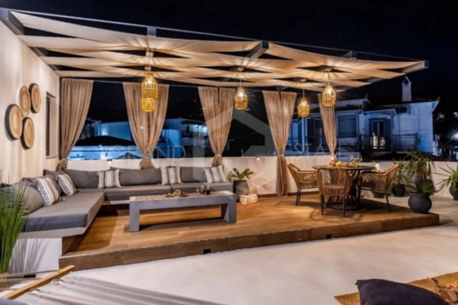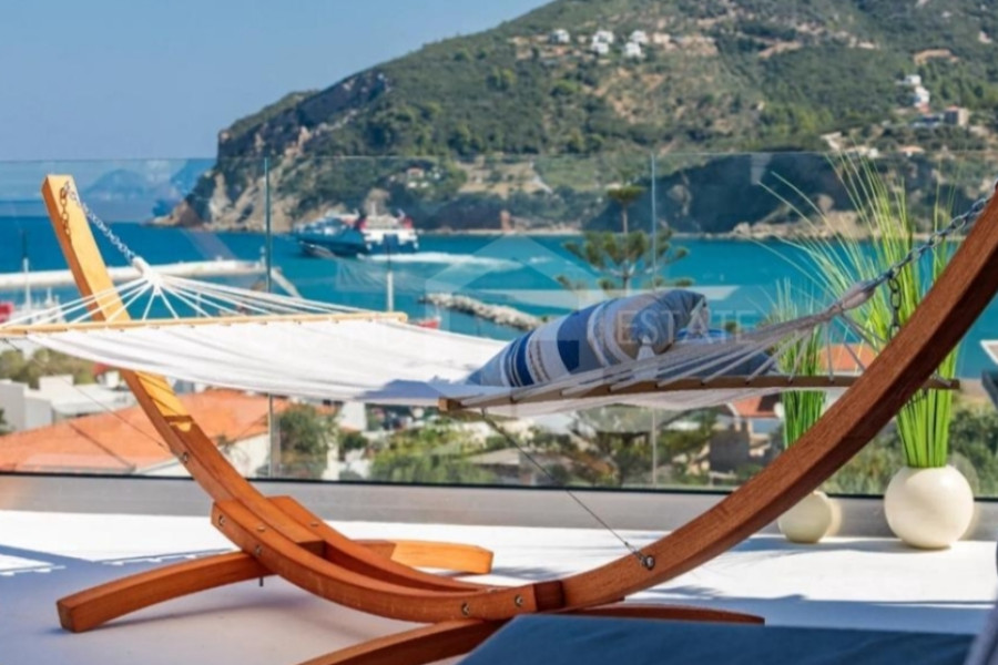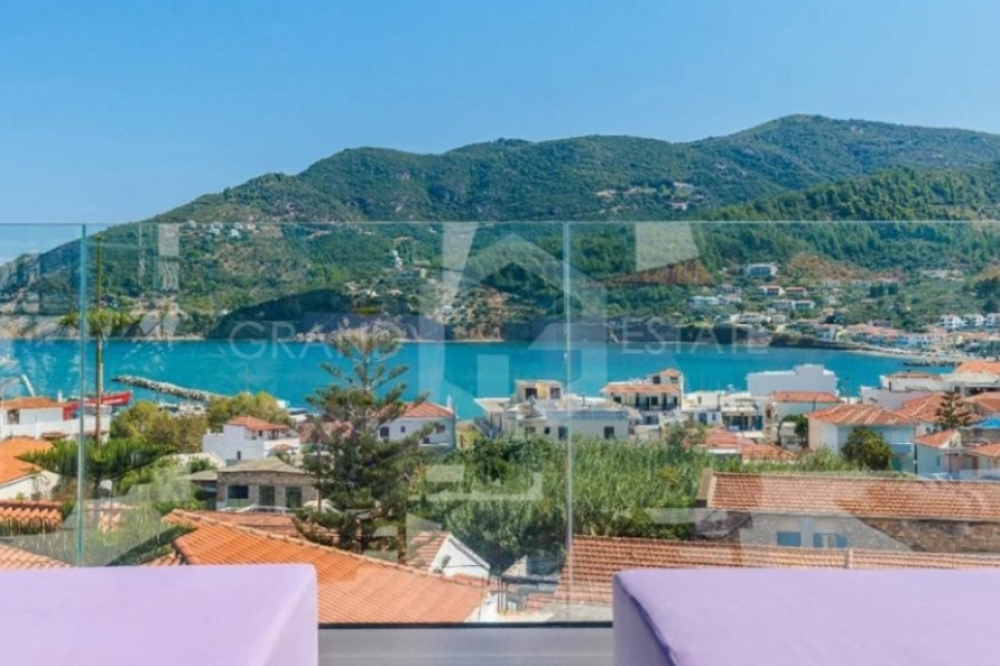 Penthouse studio for sale with a very large terrace for exclusive use with an unobstructed unique view of the sea, the port, Skopelos Town and Alonissos.