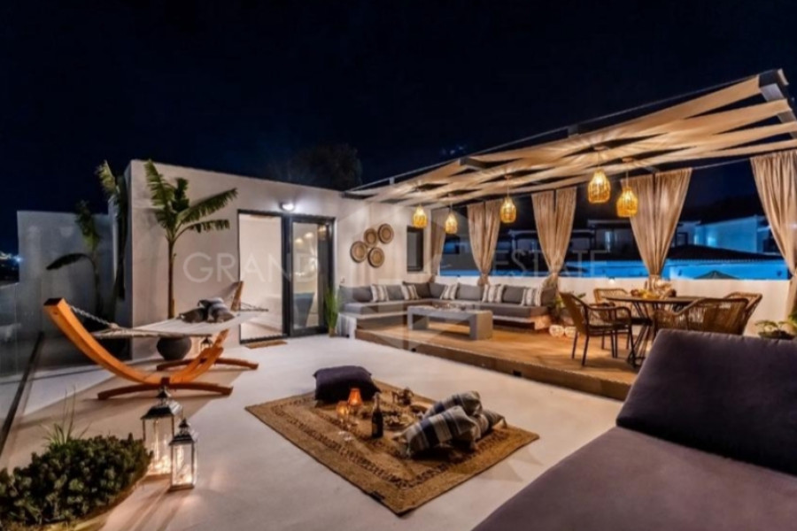 The terrace has built-in sofas, a hammock, a table for 4 people with armchairs and sunbeds with 20cm mattresses.