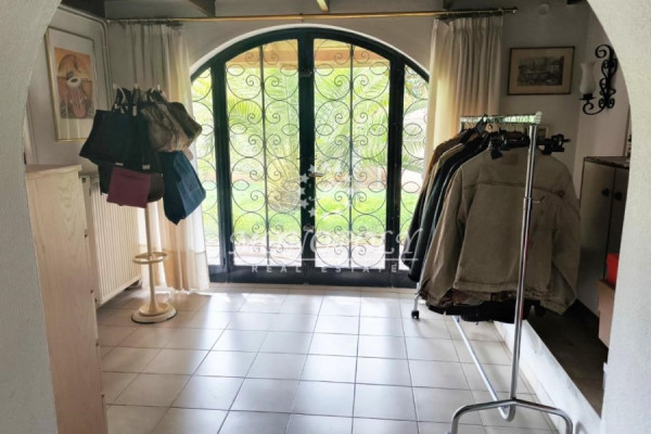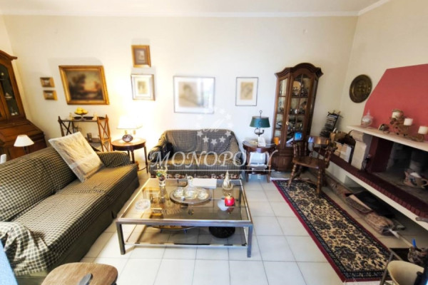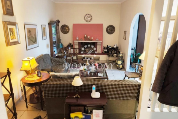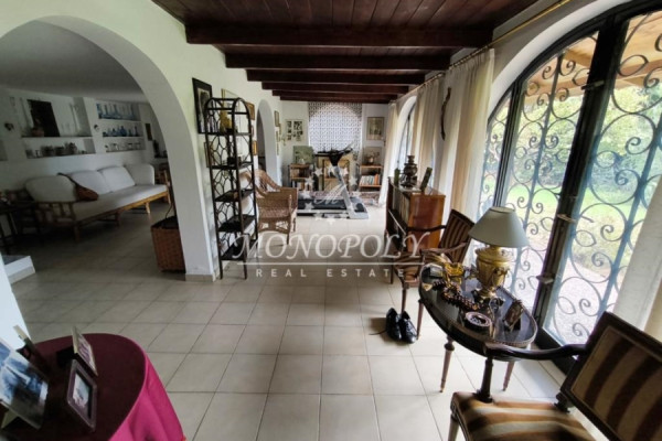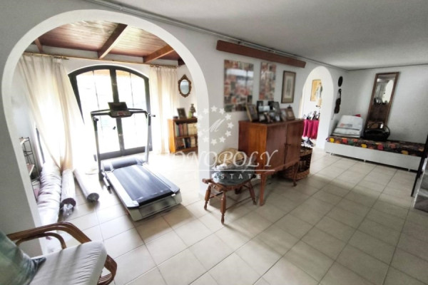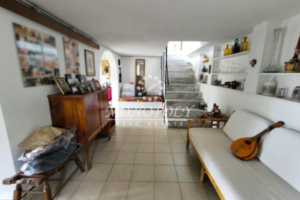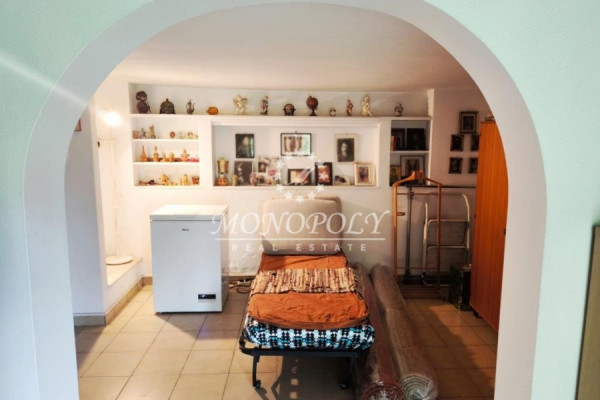 On the ground floor is a single space for use as a living room, and next to it is a two-room bedroom, with a hall with an arch, and its own bathroom. In front there is direct access from 3 balcony doors with arches, to a garden with trees and plants.