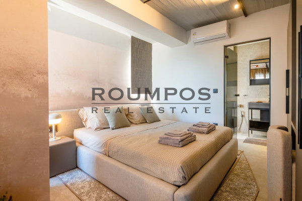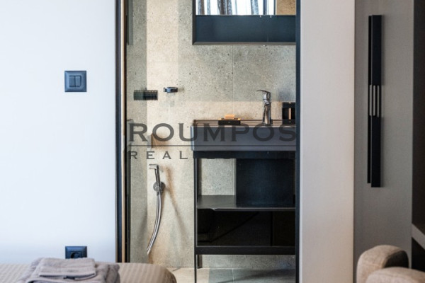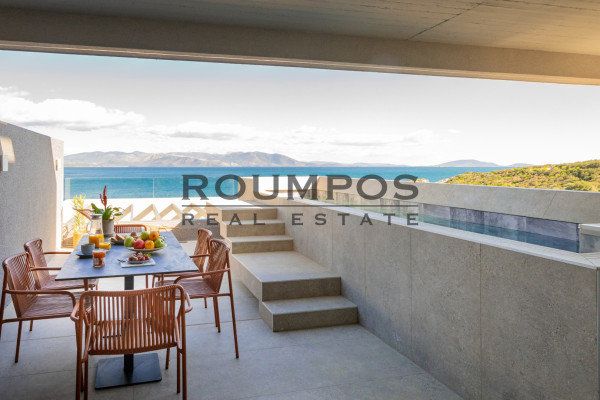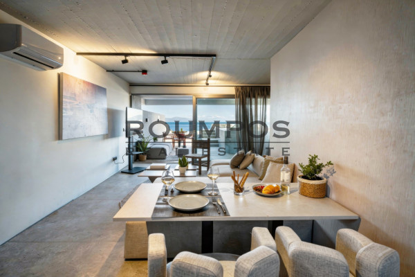 The interior layout includes an open-plan living and dining area with a contemporary kitchen, as well as three bedrooms, each with its own en-suite bathroom. There is also an additional guest WC. The apartment is complemented by spacious terraces totaling 70 sq. m., ideal for outdoor living and enjoying relaxing moments with a view of the Aegean. The construction meets high standards of quality and features aluminum window frames with double energy-efficient glazing, a security door, an installed air-conditioning system, energy class A+, a storage room, and one parking space in the underground garage. The property also includes a swimming pool, offering an exceptional level of comfort and aesthetics.