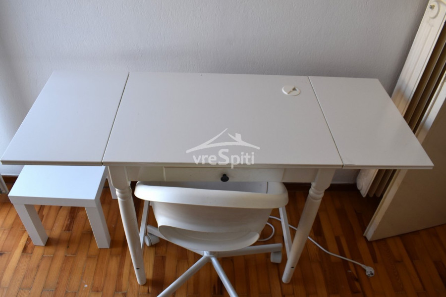 Furnished with a bed with its mattress, a desk and a dining table. Equipped with a mini-oven, a refrigerator and a washing machine.