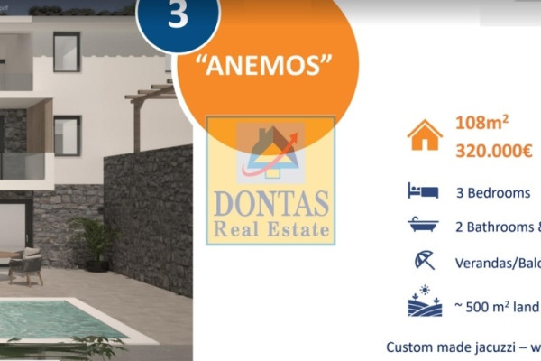 Marmari, Lykorema, Maisonette, 108 sq.m., On a plot of 500 sq.m., Under Construction, 3 Level(s), MINIMAL AESTHETIC WITH GARDEN AND POOL, WITH SEA VIEW, 3 Bedrooms, 2 Bathroom(s), 1 WC, 1 Kitchen(s), 1 Parking, Year of construction 2024, Energy Certificate: A+, Floors: Tiles, Frames: Aluminum, Features: Security Door, Alarm, Storage, Playroom, Internal Staircase, Double Glazing, Screens, Verandas, Pets Allowed, Air Conditioning, Pool, Garden, Newly Built, Independent - Heat Pump Heating, View: Sea, distance from: Sea (m): 250, Price: €320,000, Tel: 2106231555 6980502020, www.dontasrealestate.gr,