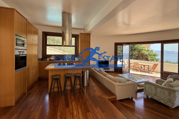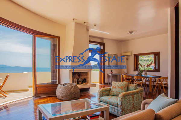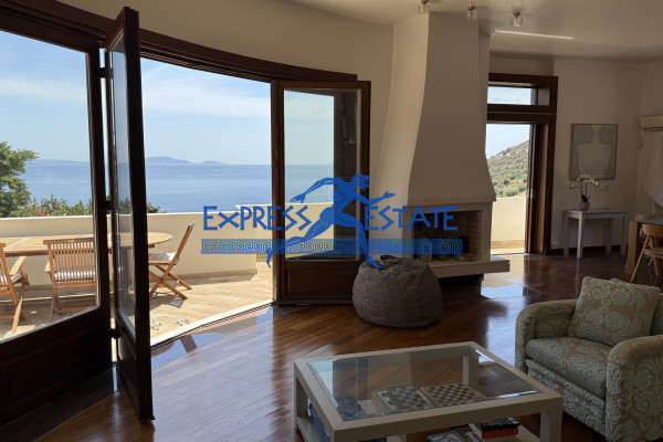 Στο ισόγειο συναντάμε ένα ευρύχωρο σαλόνι με τζάκι ,τραπεζαρία, κουζίνα, WC επισκεπτών και χώρο υποδοχής με Δρύινα ξύλινα πατώματα . Μεγάλα παράθυρα επιτρέπουν το άφθονο φυσικό φως να εισέλθει στους χώρους και προσφέρουν άμεση πρόσβαση στις εξωτερικές βεράντες, ιδανικές για πρωινά καφέ ή βραδινά δείπνα με θέα το απέραντο γαλάζιο του Ευβοϊκού και τον ανοιχτό ορίζοντα .Μια μοντέρνα άρτια εξοπλισμένη κουζίνα δεσπόζει στο χώρο .