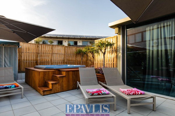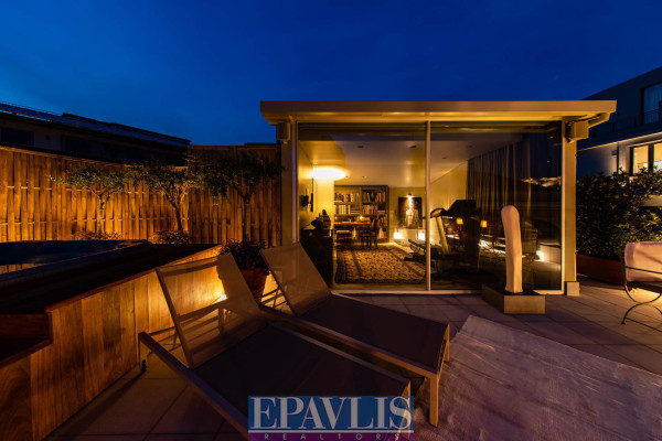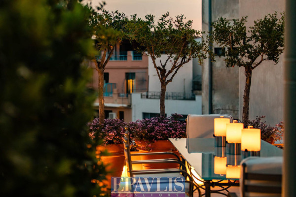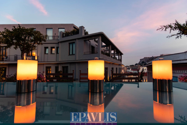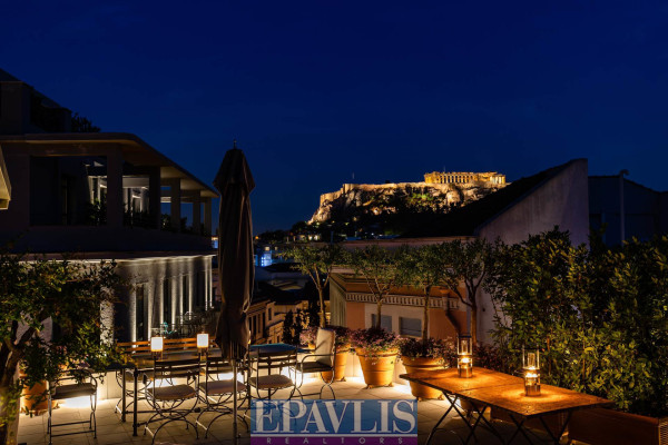 Athens, near Kolokotroni Street: Corner duplex penthouse/loft, located on the 4th and 5th floors, 125 sq.m., featuring a very large terrace and rooftop with a panoramic view of the Parthenon. The apartment has been fully renovated and includes 1-2 bedrooms, 2 bathrooms, and a spacious reception area with a double-sided fireplace and open-plan kitchen. It also offers autonomous underfloor heating with natural gas, central Daikin air conditioning, and 24-hour hot water. The property is being sold fully furnished with high-quality designer pieces, both interior and exterior. The rooftop includes an authentic jacuzzi for ultimate relaxation. Price: €1,650,000. EPAVLIS REAL ESTATE AGENTS, contact phone: 2109945719, email: