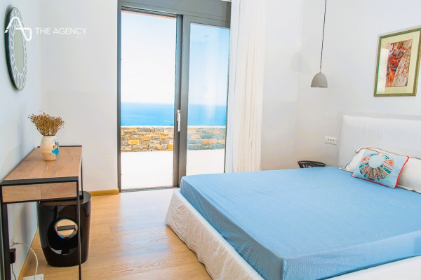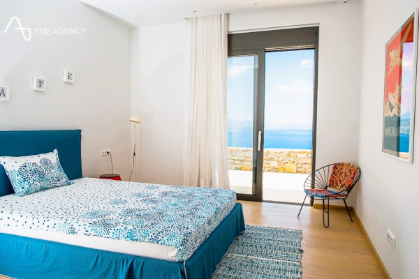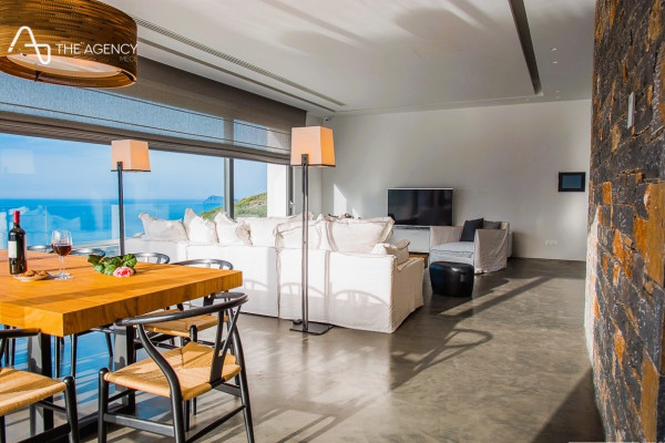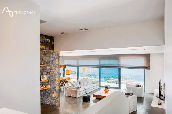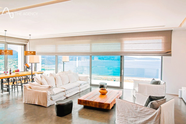 It comfortably accommodates up to 10 people with 5 bedrooms and 6 bathrooms, including four en-suite bedrooms with panoramic sea views. The spacious open-plan living room features a fully equipped modern kitchen and dining area surrounded by large glass windows that maximize the incredible views.