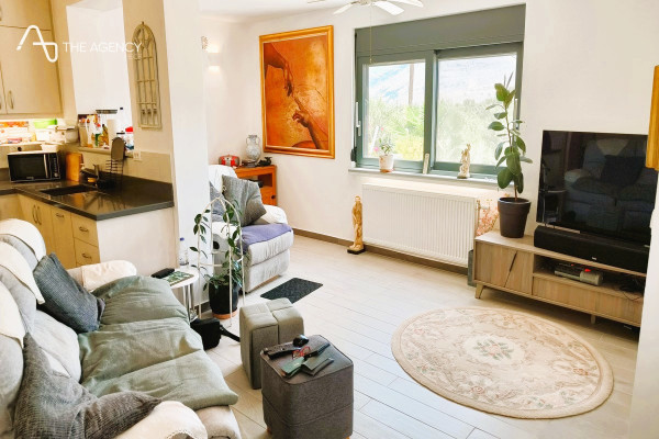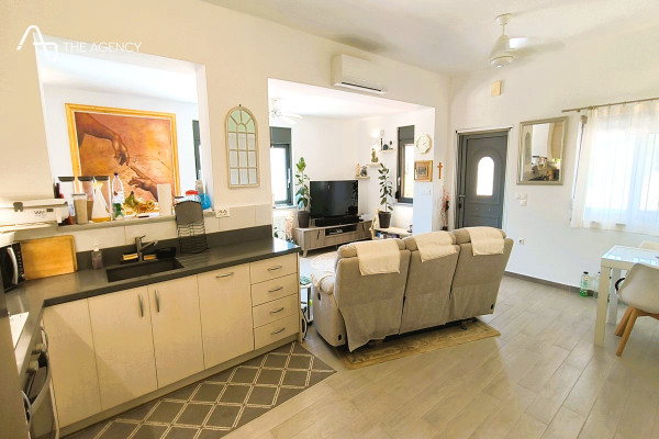 The residence has an area of 85 sq.m. and consists of a single kitchen and living room, two bedrooms and a bathroom. The kitchen is fully equipped and has a storage space/pantry. At the entrance there is a spacious, covered terrace with a sitting area, ideal for relaxation.
