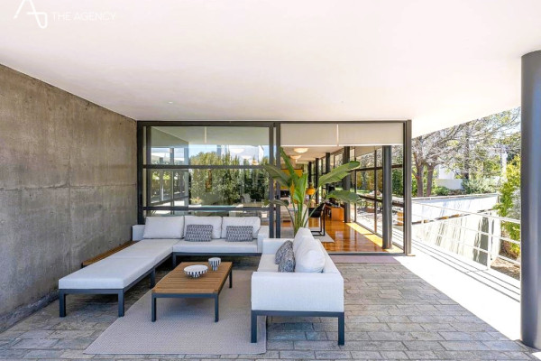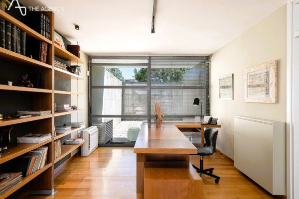 The main level features a bright and spacious living and dining area with a fireplace, premium wooden floors, and floor-to-ceiling windows that open onto the patio and outdoor spaces. A modern kitchen, 3 bedrooms, and an office space complete the upper floor, all furnished with high-end, stylish pieces.