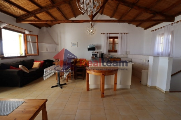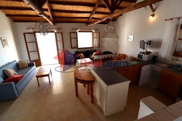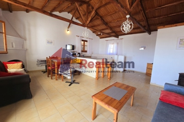 An internal staircase leads us to the upper floor of 46.50 sq.m., where we find a single-space living room and kitchen with a fireplace and a bathroom. The house has double glazing and BBQ. The floor is made of tiles and the frames are wooden. Also, there is a tank of 13.06 sq.m. for collecting water.