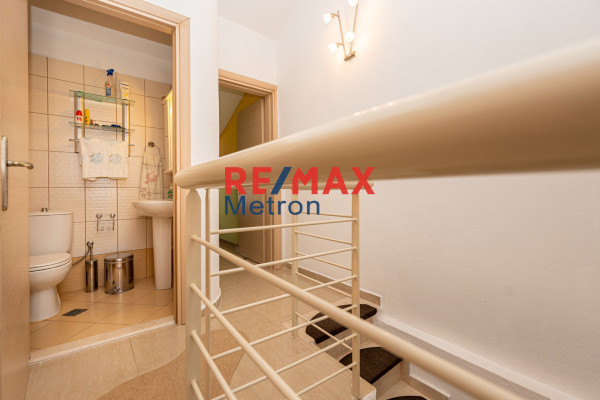 An internal staircase leads to the upper level, where there are two bedrooms and a bathroom with shower.