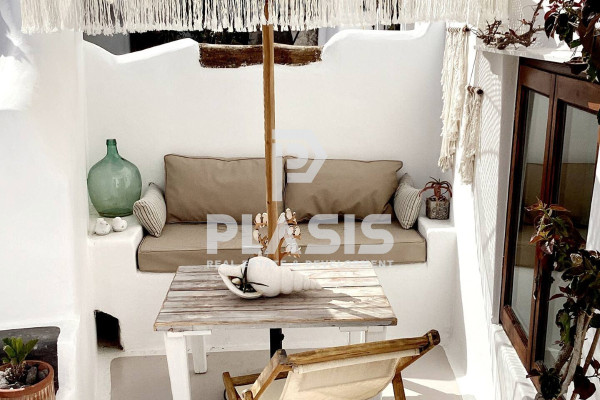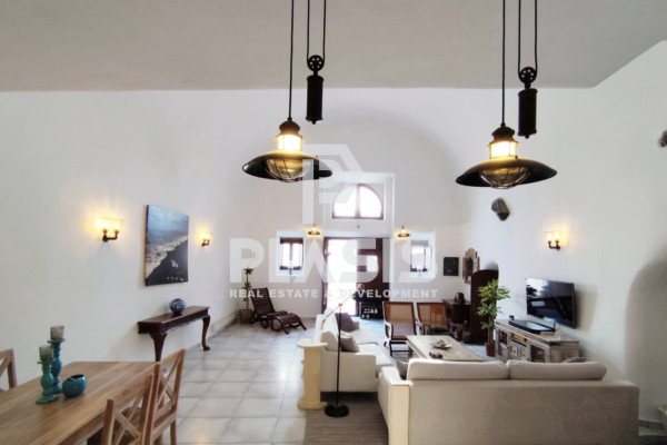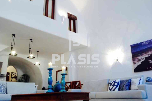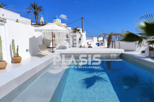 Detached house For sale, floor: Ground floor, in Santorini - Kontochori. The Detached house is 226 sq.m. and it is located on a plot of 384 sq.m.. It consists of: 5 bedrooms, 5 bathrooms, 2 kitchens, 2 living rooms. The property was built in 1950 and it was renovated in 2022. Its heating is Autonomous with Fan coil, Air conditioning, Sound insulation, Thermal insulation are also available, it has Wooden frames, the energy certificate is: B+ and its floors are Tiles. The property's status is: Freshly painted, Excellent condition, it is close to Transportation, City Center, 350 Meters from city, it has Sea, Openness view. The Detached house is Painted, Furnished, Bright, Airy, Sunny, Luxury, Traditional house, it is suitable for Investment, Revenue source and it also has the following unique features and advantages: Electric Appliances, Swimming pool, Garden, Security cameras, Quiet neighborhood. Plasis Real Estate Glyfada, contact phone: 2109601909, email: