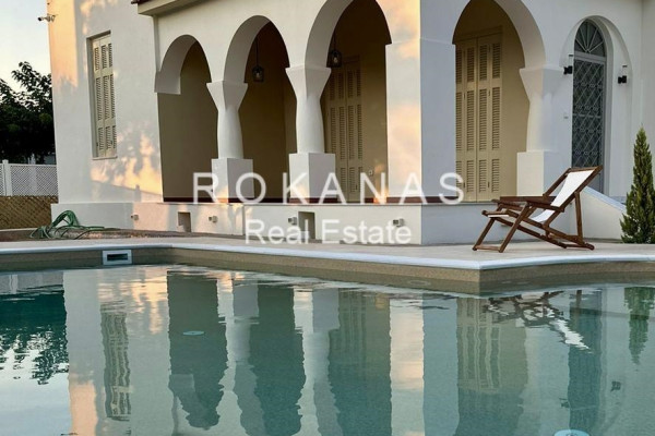 For Rent Detached house, Elliniko, Kato Elliniko, 240 sq.m., In plot 625 sq.m., 3 Levels, Ground floor Floor, 3 Bedrooms, 3 Bathrooms, 1 WC, 1 Fireplace, Floors: Wooden floors + Marble, Frames: Wooden, 1 parking, Building Year: 1960, Certificate Energy: A+, Feautures: Security door, Security alarm, CCTV, Storage room, Fireplace, Playroom, Internal Staircase, Double Glazed Windows, Window Screens, Balconies, Pets Allowed, Stonehouse, Preserved, Luxury, Mansion, Airy, Roadside, Bright, On Corner, AirConditioning, Solar water system, Swimming pool, Back yard (Garden), Painted, Renovated, Autonomous - Fan Coil Heating, Price: 7.500€