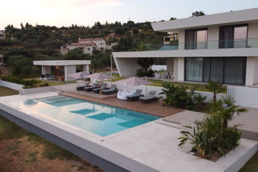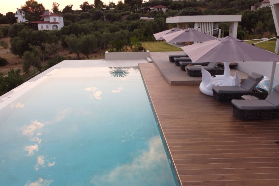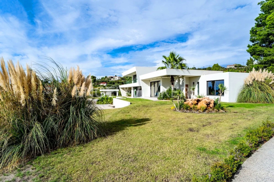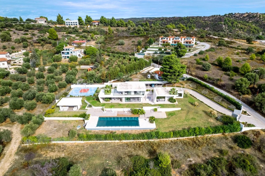 An architectural masterpiece by the sea – a 395 sq.m. villa with a guesthouse and pool in Kalogria, Sithonia. OVERVIEW: Imagine mornings on a panoramic terrace overlooking the Aegean Sea, where the villa's architectural geometry creates a play of light and shadow, and the Mediterranean nature surrounds your space. This unique villa in Sithonia is a rare opportunity to own a family estate with unique contemporary architecture on a spacious plot just minutes from the peninsula's famous beaches. Two independent buildings totaling 395 sq.m. on a 4,000 sq.m. plot, ready for occupancy, with premium finishes and Golden Visa compliance. Class B energy efficiency, panoramic views, and thoughtful infrastructure for year-round family living or seasonal holidays.