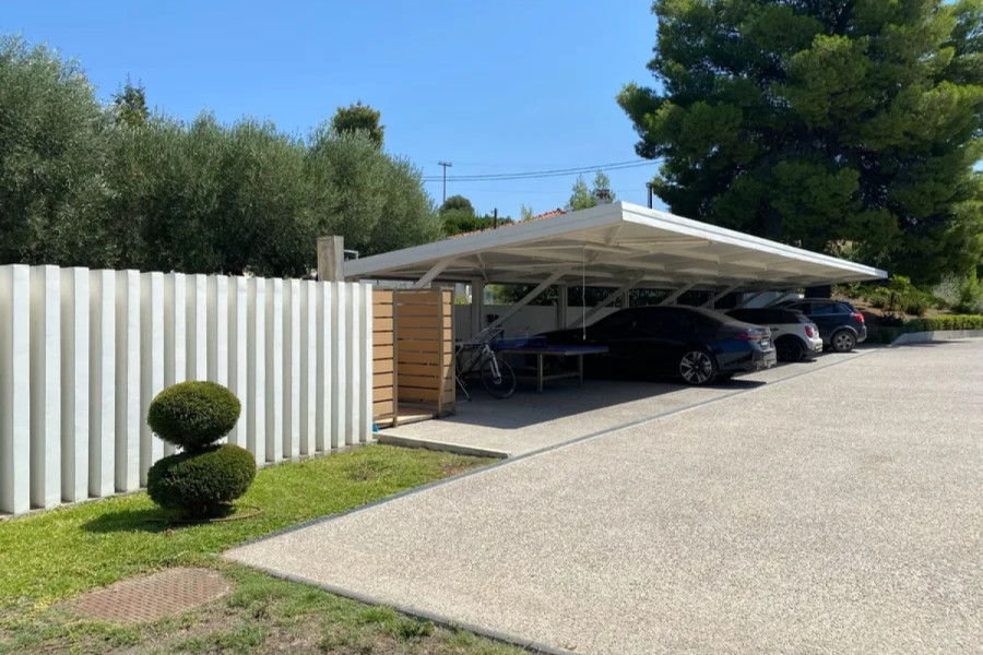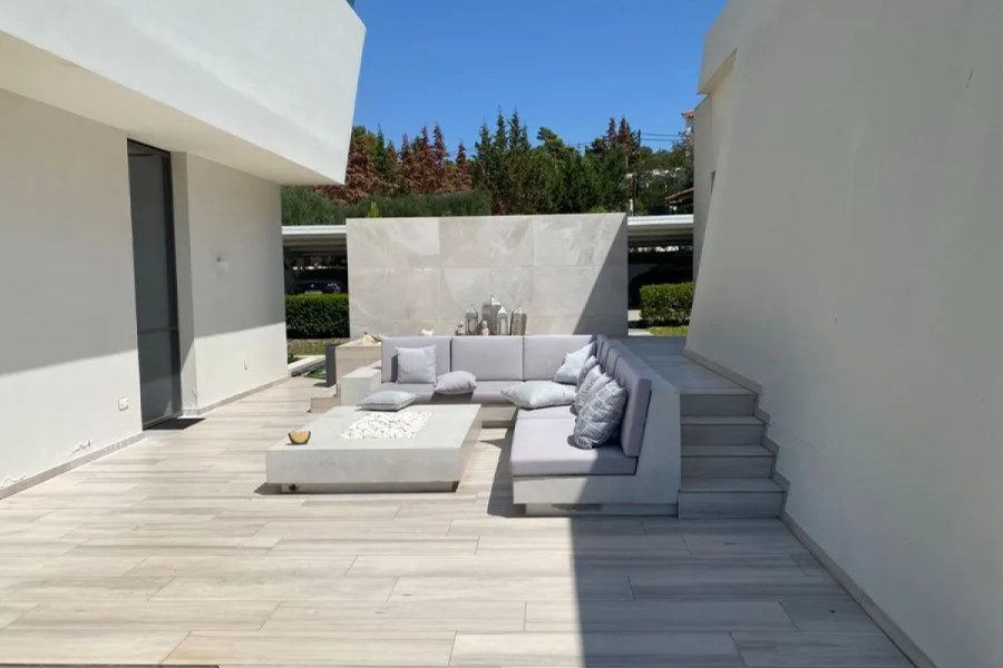 MAIN FEATURES OUTDOOR - Corner plot of 4000 sq.m with automatic irrigation - Swimming pool of 101 sq.m with a relaxation area, volume of 152 cubic meters - Covered terraces with dining areas and glass railings - BBQ area with a summer kitchen - Mediterranean landscape - olive trees, ornamental plants, palm trees - Covered parking for 2 cars, open spaces for 3 cars - Storage rooms - Asphalt driveway - Sports ground
