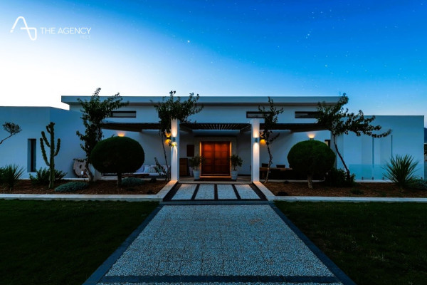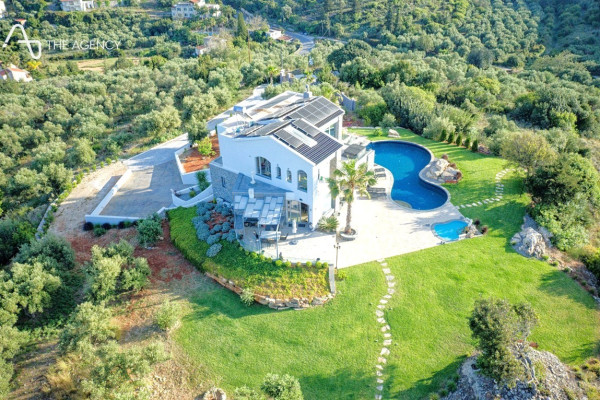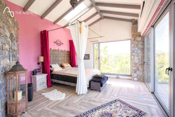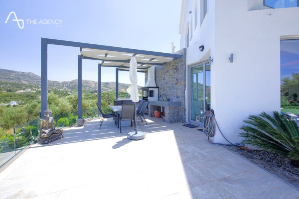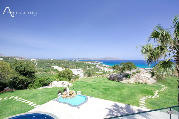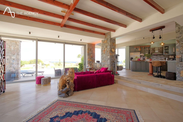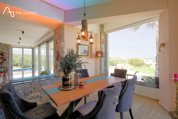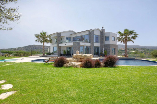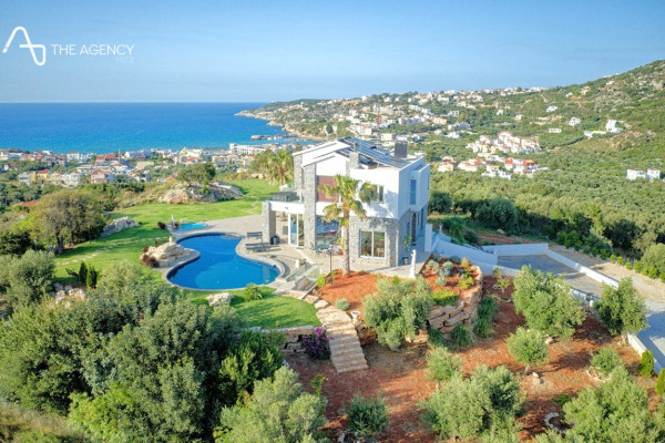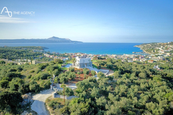 Luxury villa for sale in Apokoronas, Chania, in the Almyrida area, with a 360° panoramic view of the sea and the White Mountains. The property has 352 sq.m. of habitable surface on a private plot of 4,935 sq.m. It is spread over 3 levels and includes 5 bedrooms and 3 bathrooms.