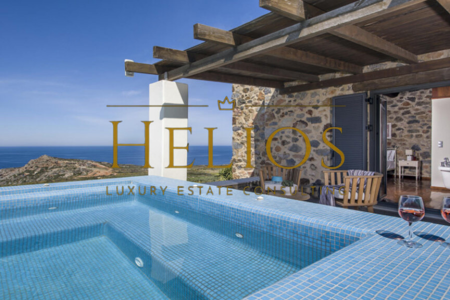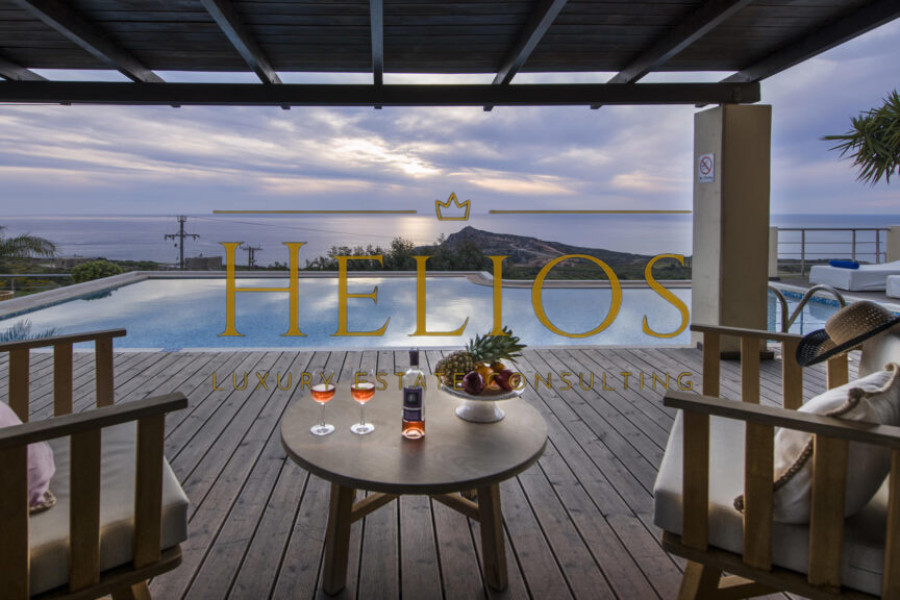 Overlooking the breathtaking landscape below, which fades into the blue of the Cretan sea, this stunning property offers unparalleled serenity and spectacular sunsets that paint the sky every evening.