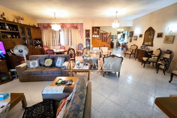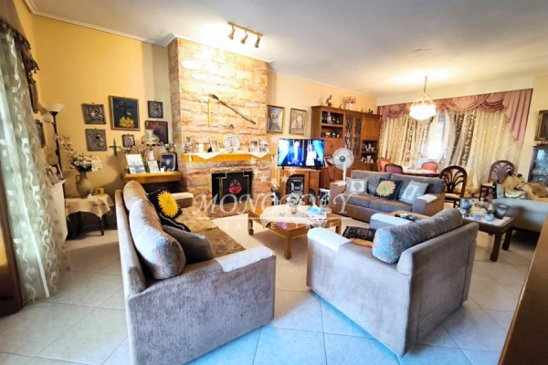 Consists of a high 1st floor of 112sqm. with a very large living room, with space for a 2nd living room and a dining room, with tiled floors, a large stone fireplace, a bar and access to a large and wide, corner veranda.