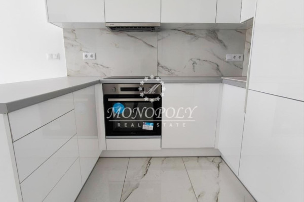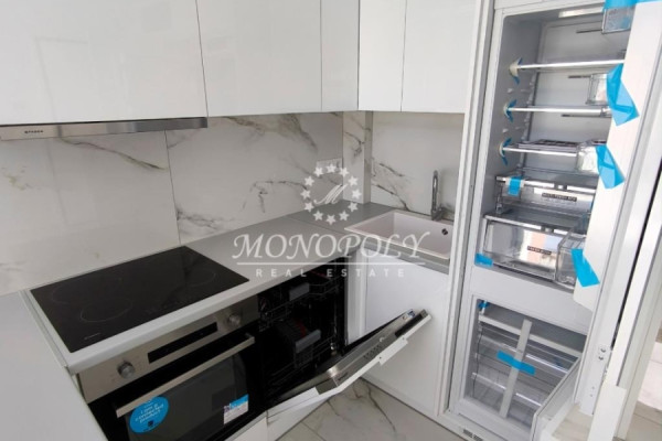 It consists of a living room with tiled floor, large front balcony with south orientation, open plan kitchen with a built-in appliances (kitchen, refrigerator, dishwasher, washing machine), 1 bedroom and a 1 bathroom with a shower.
